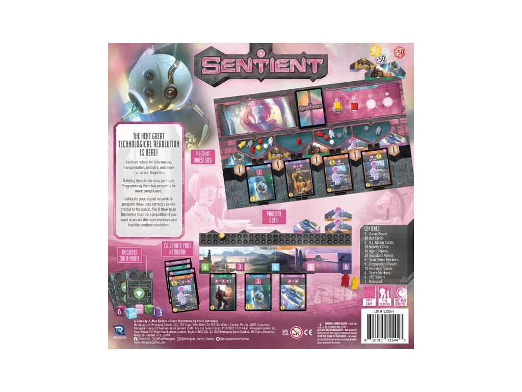 In Sentient, players are tasked with choosing from available robots to program in their factory. Each robot that is added modifies your board and attracts the interest of investors for your company. Program your bots efficiently and collect the support of your patrons to build the most formidable operation.