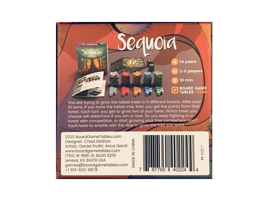 Ve hře Sequoia se snažíte vypěstovat ty nejvyšší stromy v 11 různých lesích. Pokud máte po 10 kolech nejvyšší strom, získáváte za daný les vítězné body. V každém kole necháte vyrůst dva své stromy. To, které z nich to budou, rozhodne o vaší výhře či prohře. Budete bojovat s konkurencí nebo se přesunete jinam?
