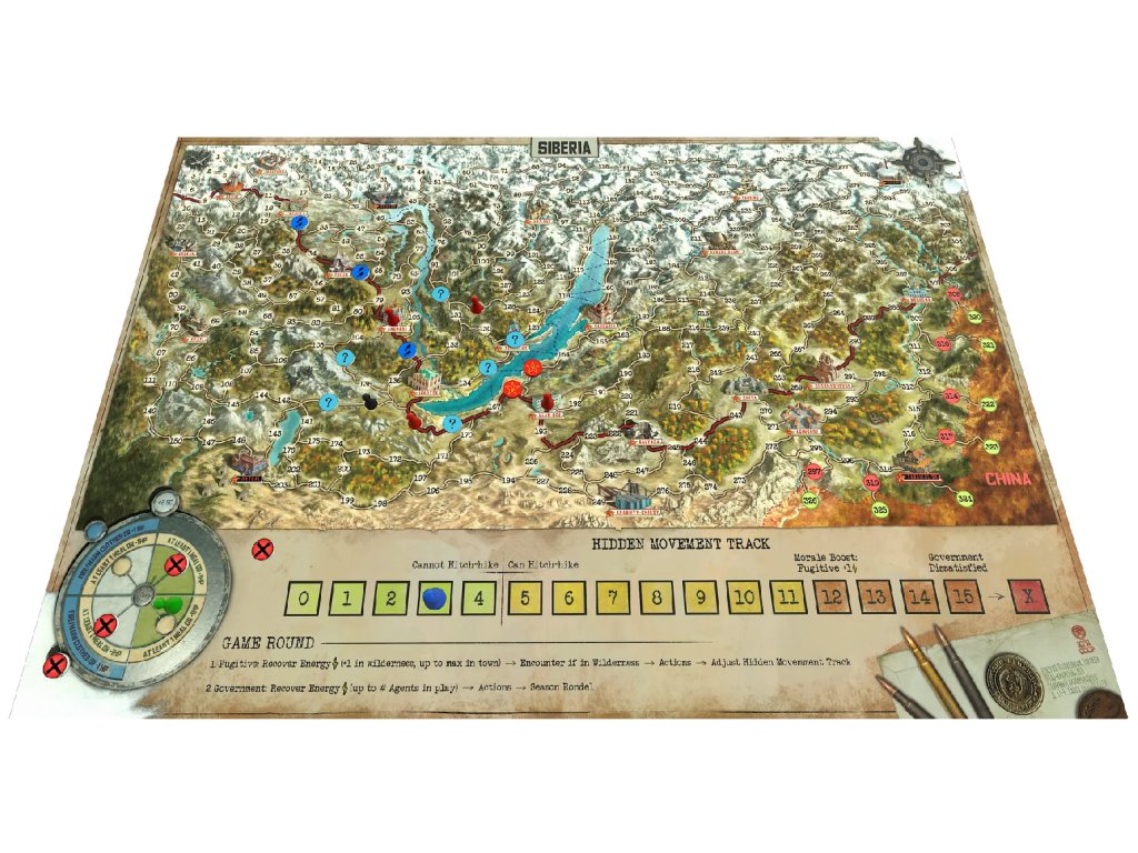 Siberian Manhunt is an asymmetrical hidden movement game for two players. One player takes the role of a U-2 spy plane pilot who has crashed behind enemy lines and must escape across the border into China. The fugitive must use their wits to navigate the dangerous landscape, survive encounters with predatory animals, and avoid starvation and hypothermia, all while being pursued by the KGB. Do they dare enter towns, risking detection by the local authorities, or will they strike out into the wilds and rely on their wilderness survival skills to stay alive?