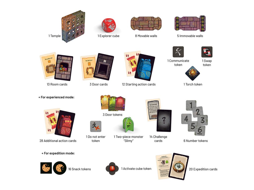But that's easier said than done because the temple is a maze of movable walls and mysterious mechanisms! Now it's time to work together. Using your action cards, you'll navigate through this unique structure, move walls, and even rotate the entire temple!