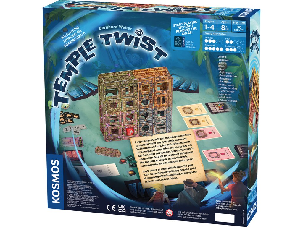 In the action-packed co-operative game Temple Twist, players take turns choosing an action card from their hand to strategically manipulate the three-dimensional temple and move the explorer cube through the maze of rooms. Play through a series of increasingly difficult expeditions, or pick up some challenge cards and dive right in. This game combines strategy, co-operation, spatial reasoning, and hands-on action with a first-of-its-kind 3D-maze-gameboard that changes as you play.