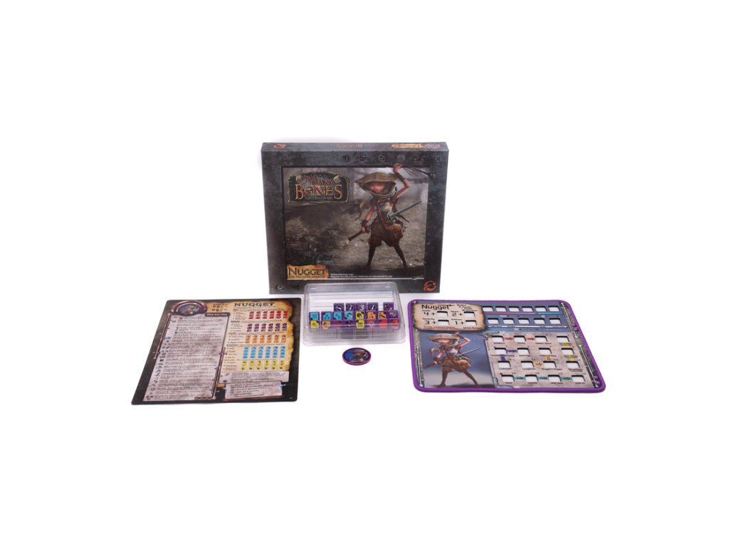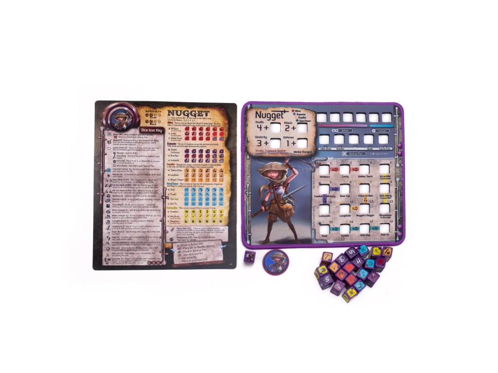 Nugget’s ability to switch between melee and ranged combat makes her a versatile choice for any adventure. She’ll propel your Gearlocs to victory using the classic Gearloc accoutrement—character mat, Gearloc chip, skill dice, stat dice, and initiative die. Nugget is a lucky choice to have on your team because she’ll keep you loaded up with loot while she dashes and tumbles out of the way.