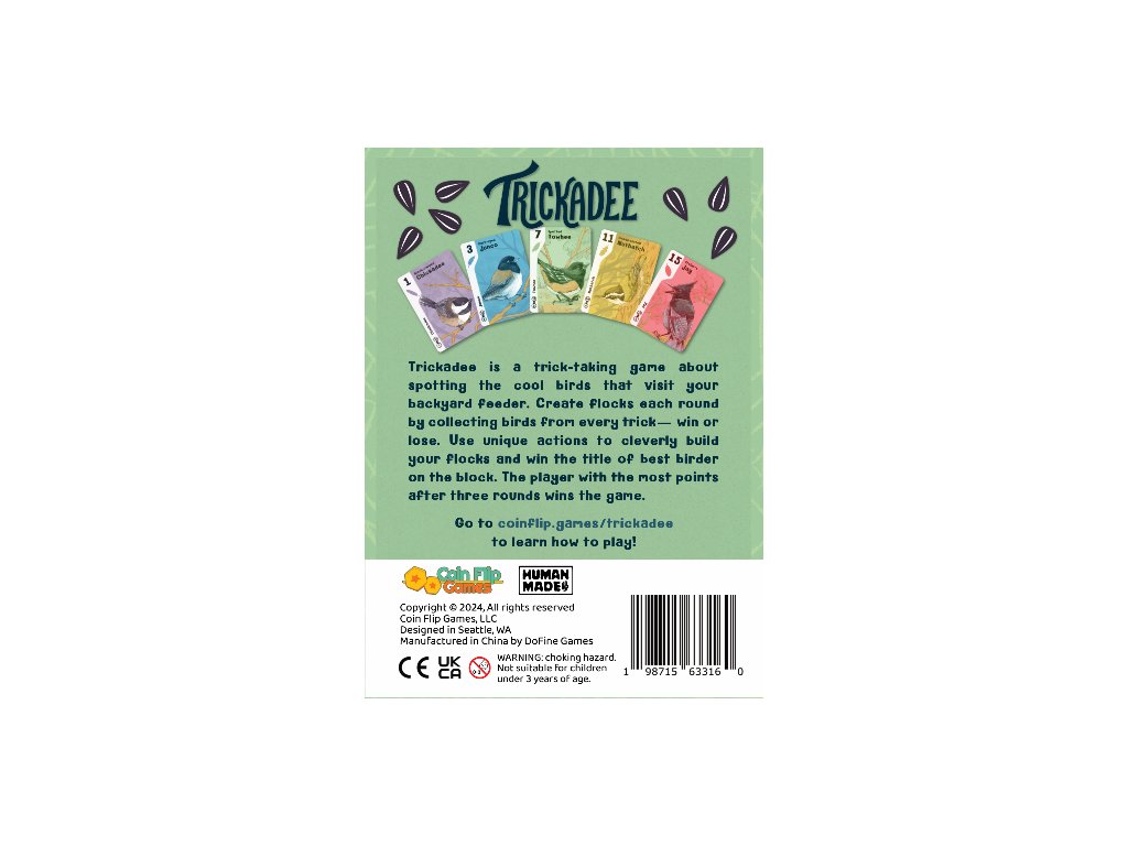 Trickadee is a trick-taking game about spotting the cool birds that visit your backyard feeder. Create flocks each round by collecting birds from every trick— win or lose. Use unique actions to cleverly build your flocks and win the title of best birder on the block. The player with the most points after three rounds wins the game.