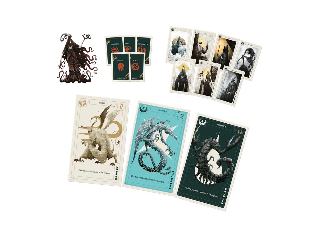 The Celestials expansion is focused on introducing more deduction and misdirection to the game and adds a new miniature, renown tracker, spell cards, and 7 celestial cards.
