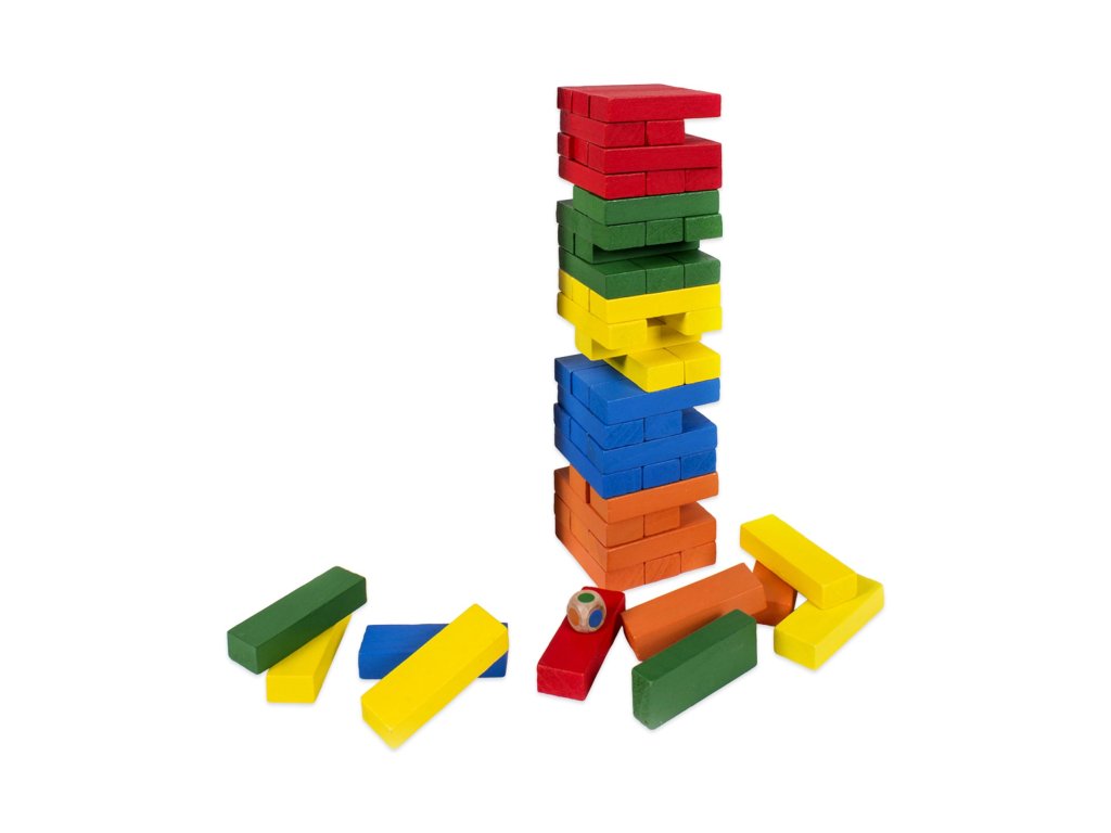 The game includes: 60 colored wooden blocks, a dice, and rules.