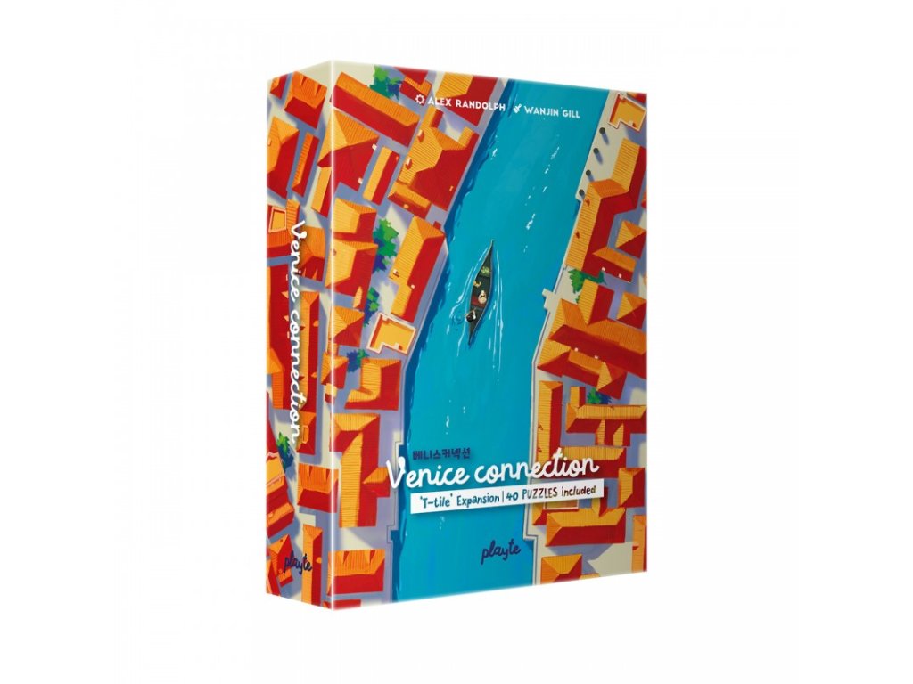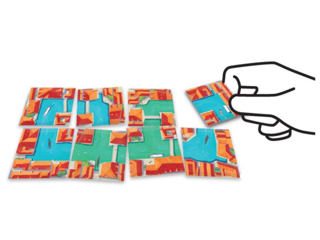 Venice Connection is a river-building / tile-placement game for two players. Your goal is to complete the canal in a loop. The game consists of 16 identical tiles, each with a straight section of canal on one side and a bend on the other. All the tiles are available for either player to use, and on a turn you place 1-3 tiles connected in a straight line adjacent to at least one other tile already in play (except on the first turn when you just place these tiles on the table).