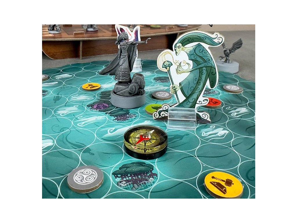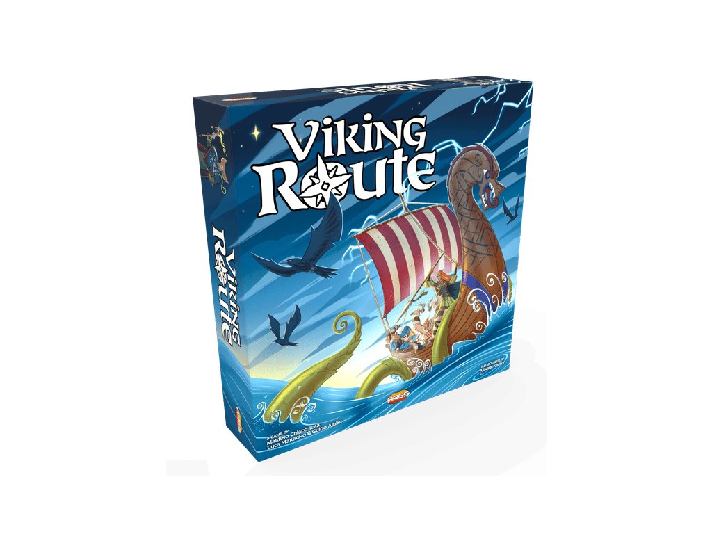 Viking Route is a cooperative adventure where players guide a Viking crew through mythical lands and dangerous seas, striving to achieve their final objective in each Scenario while facing enemies that try to thwart their mission. The game features an innovative magnetic navigation system: Odin's Ravens and the Wind spirit miniature influence the Compass, representing the Drakkar, creating dynamic tactical choices.