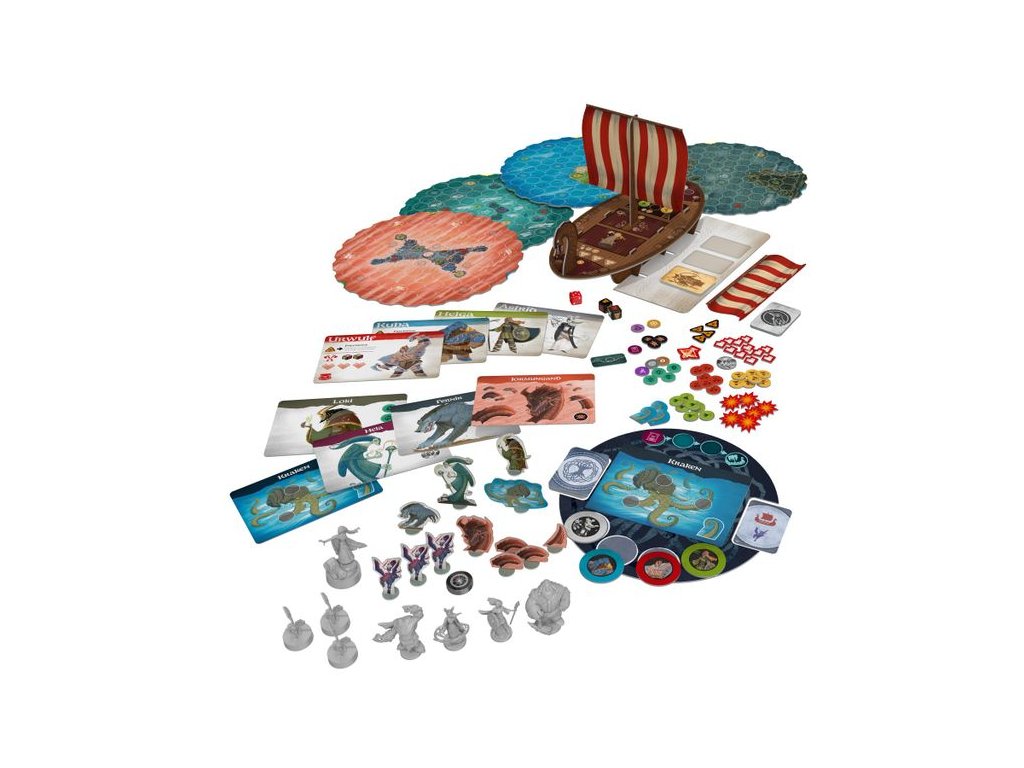 The 3-D cardboard Drakkar is managed by players and divided into Zones for specific actions: operating the Ballista, adjusting Sails, managing Resources, or steering with the Tiller. When enemies like Valkyries or monsters reach the Compass on the map, they board the Drakkar, triggering the game’s most direct combat and tactical phase. Vikings can also disembark to collect Magic Stones and Resources before returning to the ship.