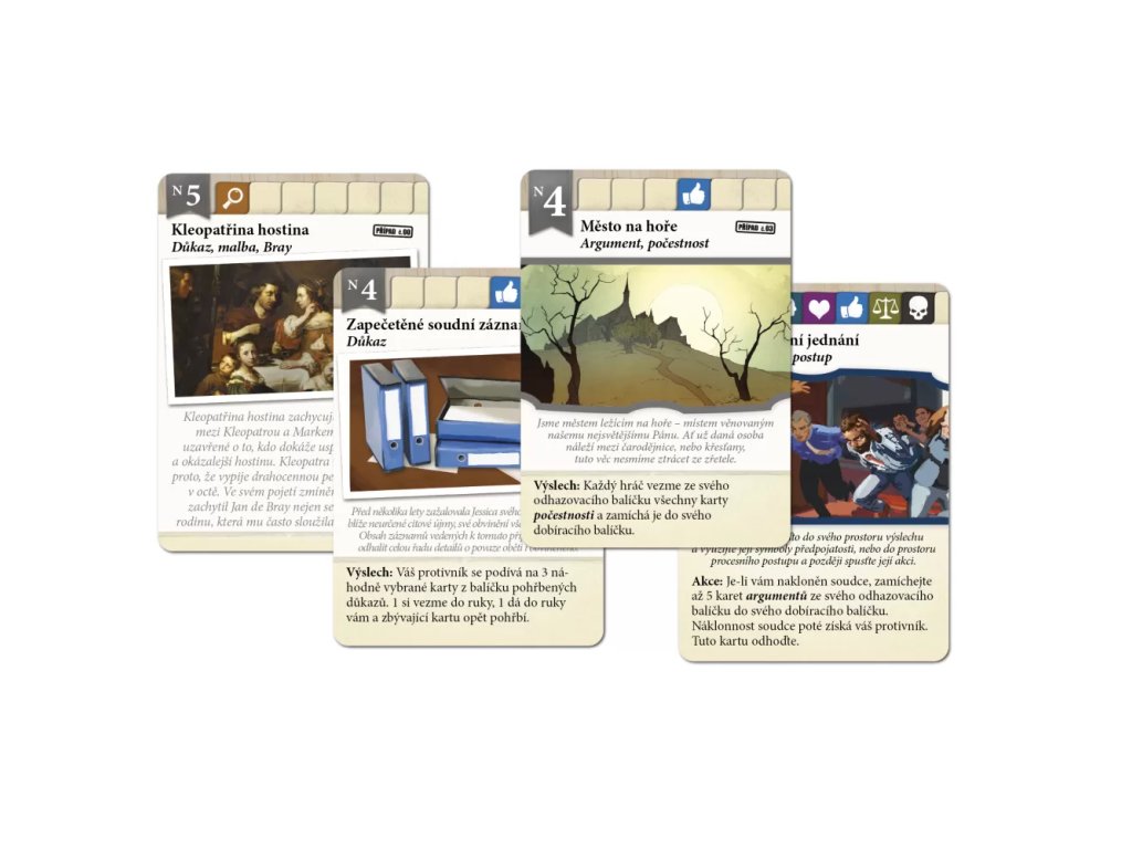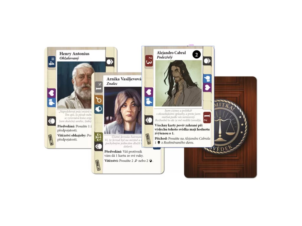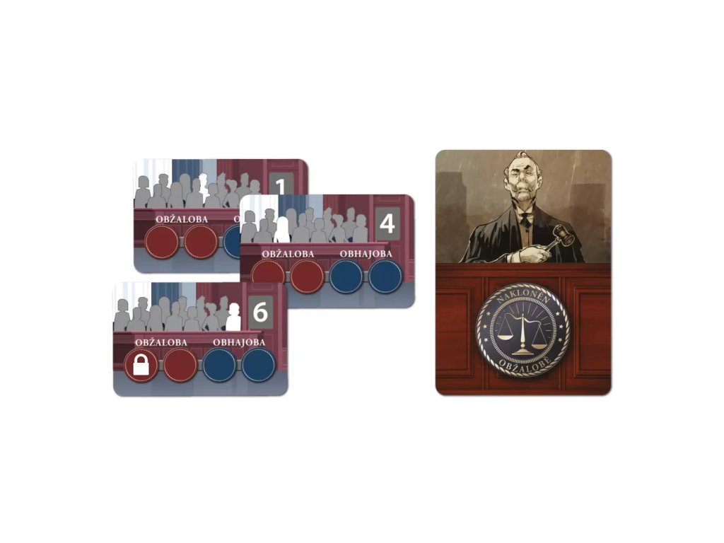 Námitka! ( Lawyer Up!) is an asymmetrical two-player game set in a dramatic courtroom environment. One player represents the honest and fair prosecution, the other the unwavering and tenacious defense. Each game begins with an introduction to the case file, during which the players choose vital evidence cards with which to support their case or, conversely, bury evidence that could help their opponent.