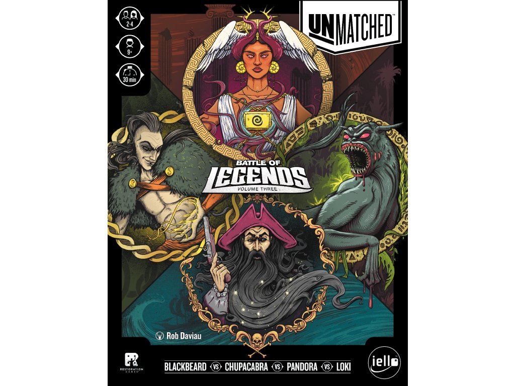 Battle of Legends, Volume Three features four disparate heroes: the pirate Blackbeard, the beastly Chupacabra, the trickster Loki, and the cursed and gifted Pandora. (Blackbeard, Chupacabra, and Loki are all runners-up from a deck-design contest.)