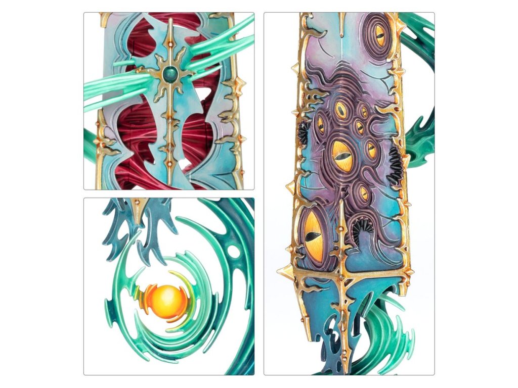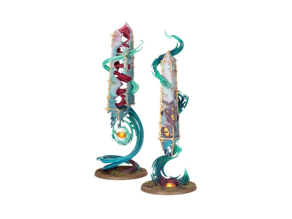This multipart plastic kit builds a pair of Argent Shards, faction terrain for your Disciples of Tzeentch armies in games of Warhammer Age of Sigmar. These columns of sorcerous energy empower nearby forces, giving you a vital edge to help enact your nefarious plans.