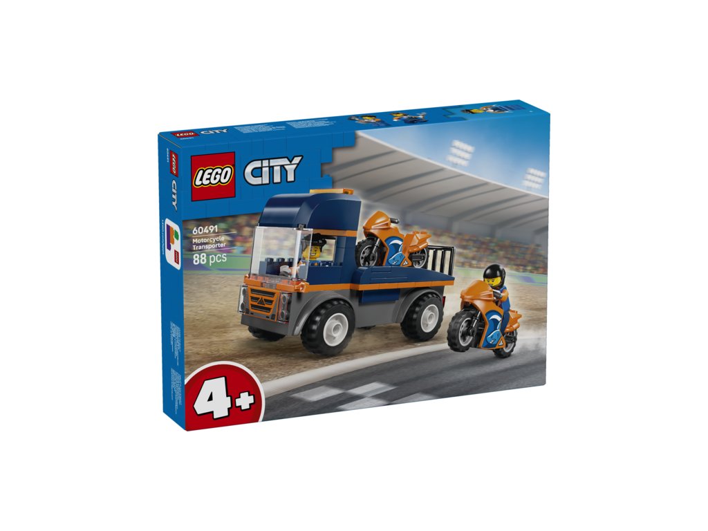 Introduce kids aged 4+ to a world of imaginative play with the LEGO® City Motorcycle Transporter (60491) toy building kit. This toy vehicle playset includes a flatbed truck toy with chunky rubber tyres, 2 sporty motorcycle toys and 2 racer minifigures with helmets. Kids can load and unload the bikes using the ramp, play out epic motorcycle race action and seat a minifigure in the cab for fun on-the-road adventures.