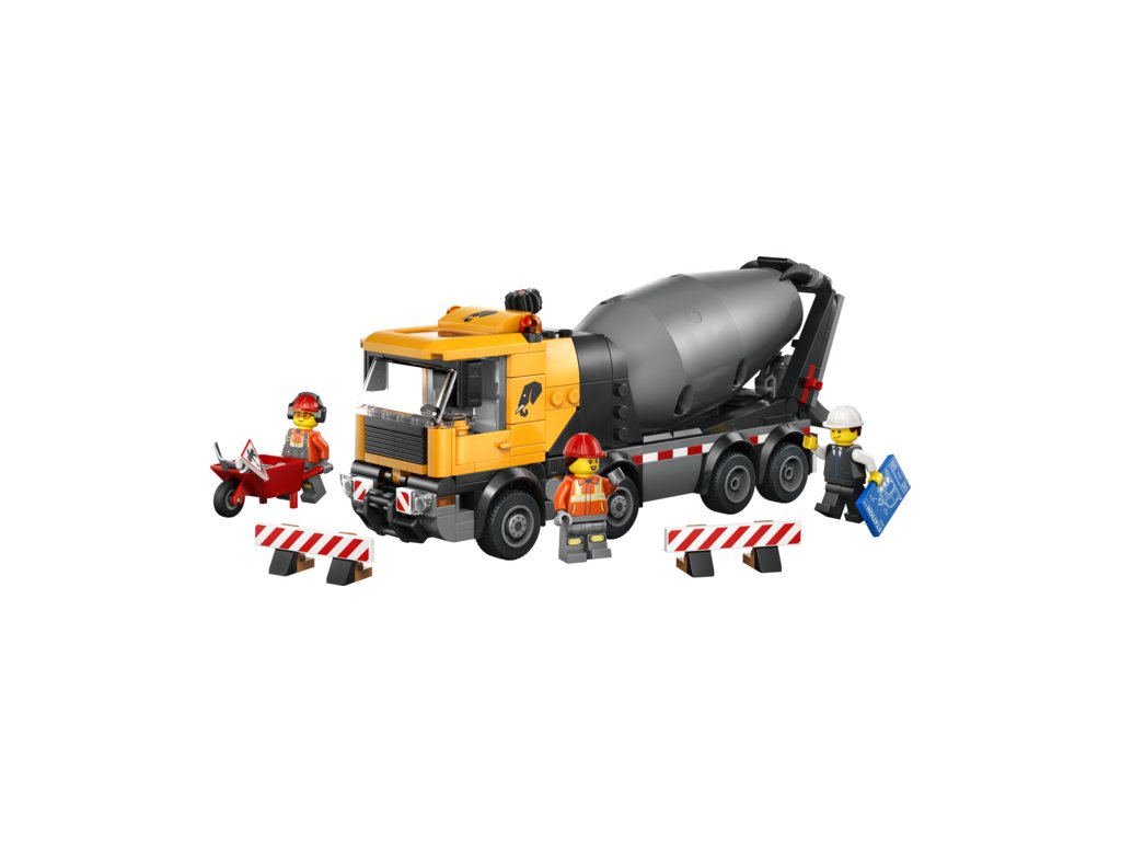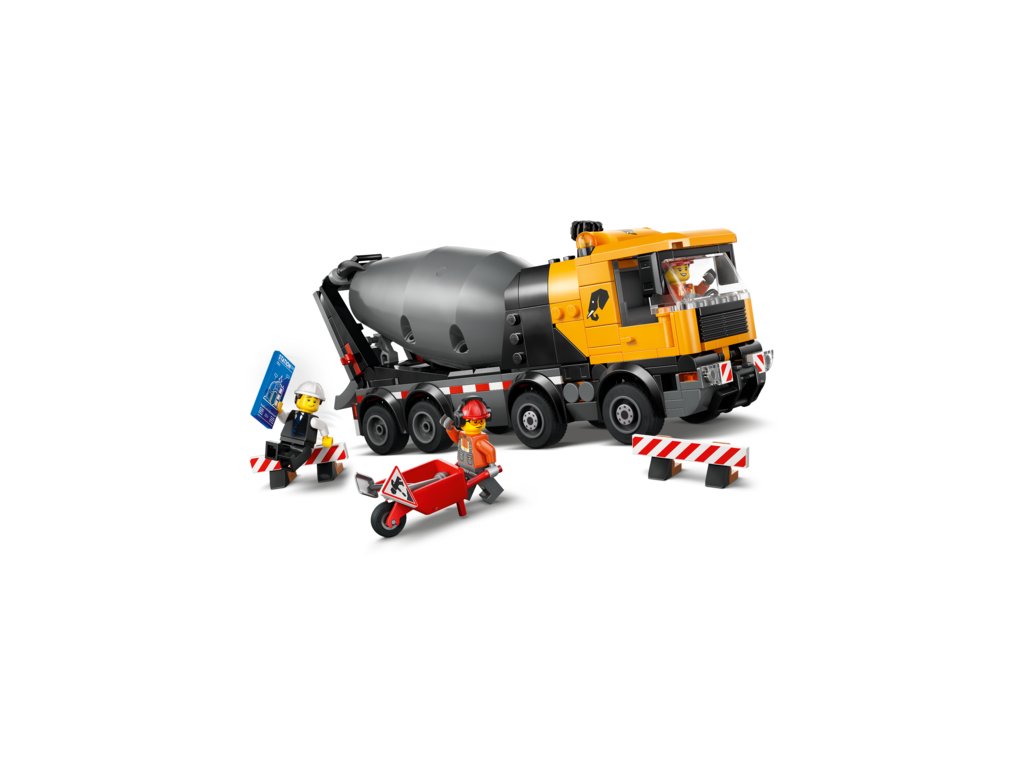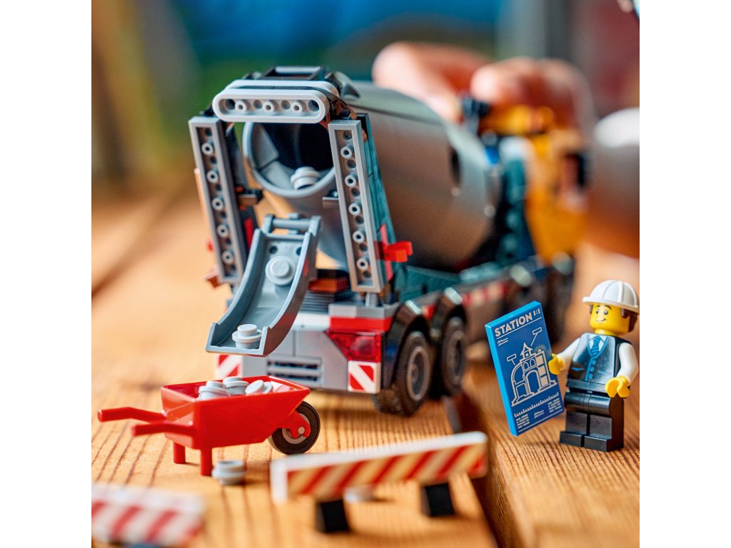 LEGO® MINIFIGURE ACCESSORIES – This cement truck model comes with LEGO accessories including a wheelbarrow, road sign, 2 barriers, a clipboard, spade and broom