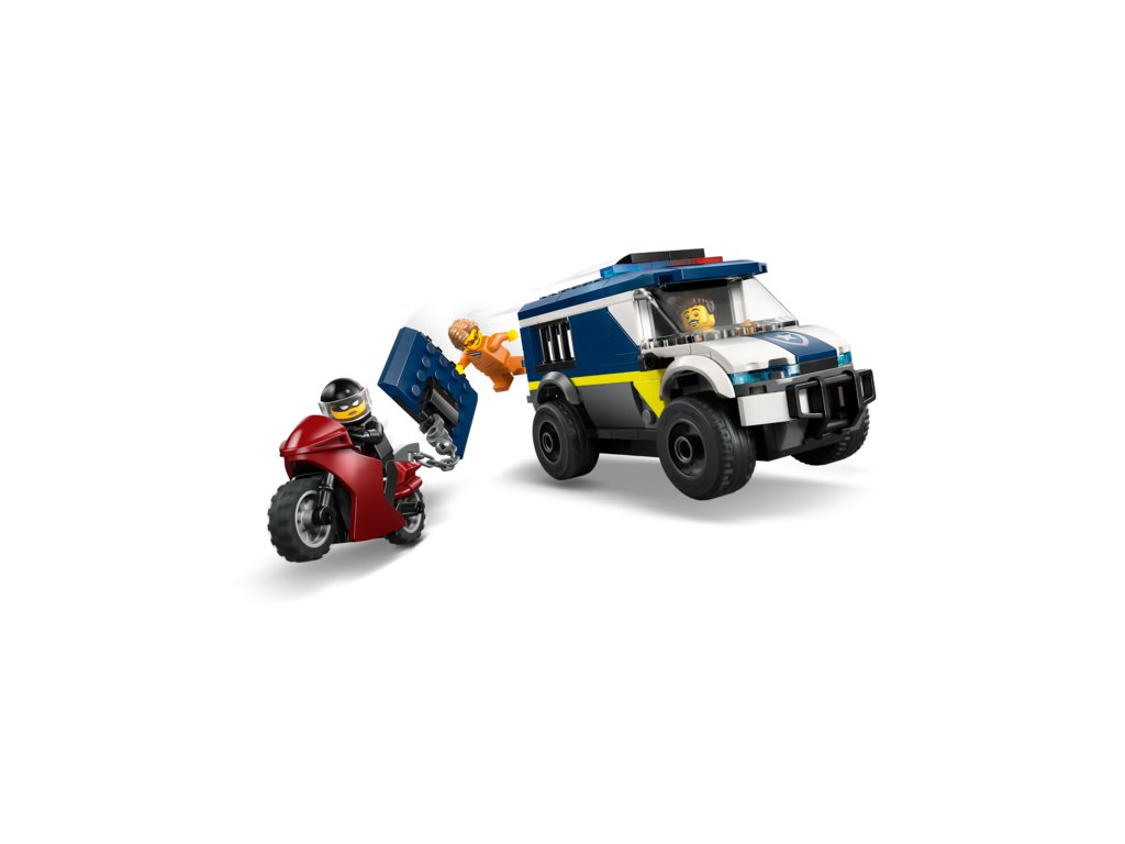 JAILBREAK ESCAPES – Kids can put the police driver minifigure in the toy van, lock crooks in the onboard cell and use the model motorcycle hook to pull off the cell door for epic escape action