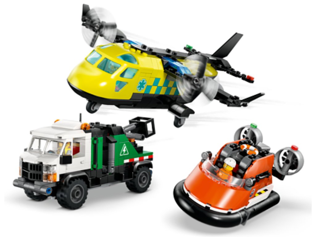 INCLUDES 3 ICONIC VEHICLES – This model building kit includes a LEGO® City medical plane, coast guard hovercraft and service truck, plus medic, coast guard and mountain rescuer minifigures