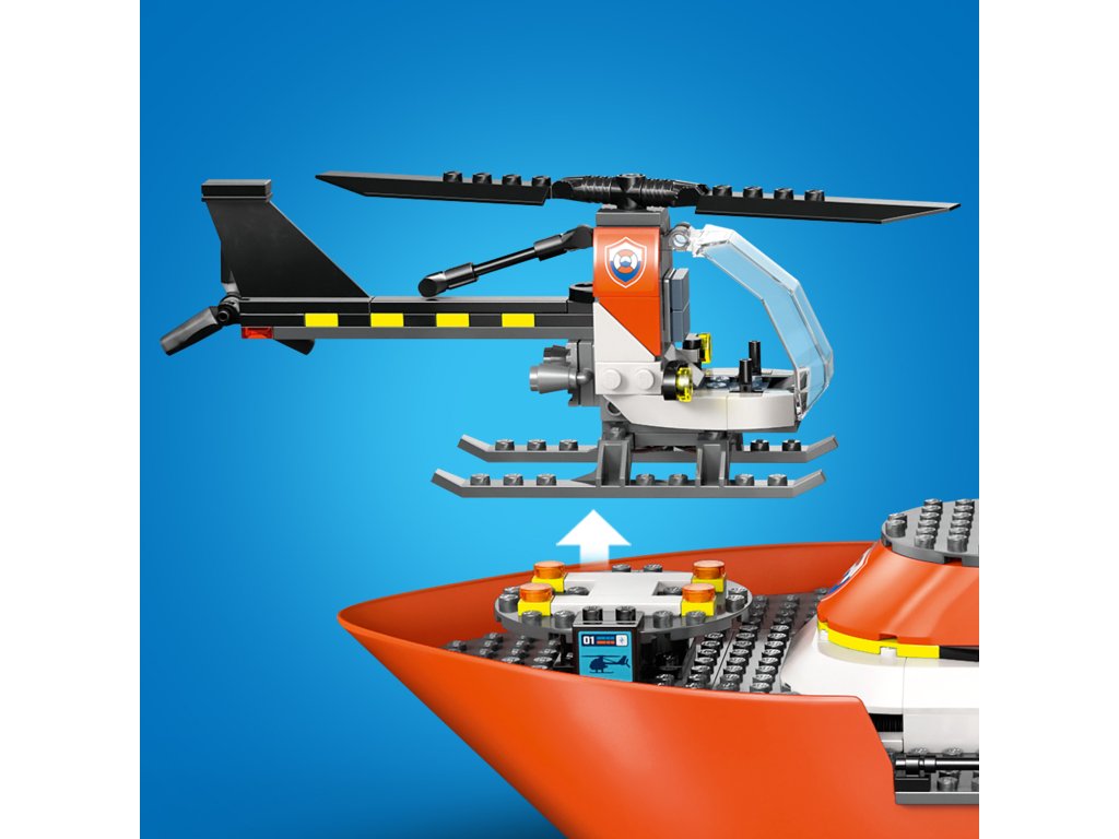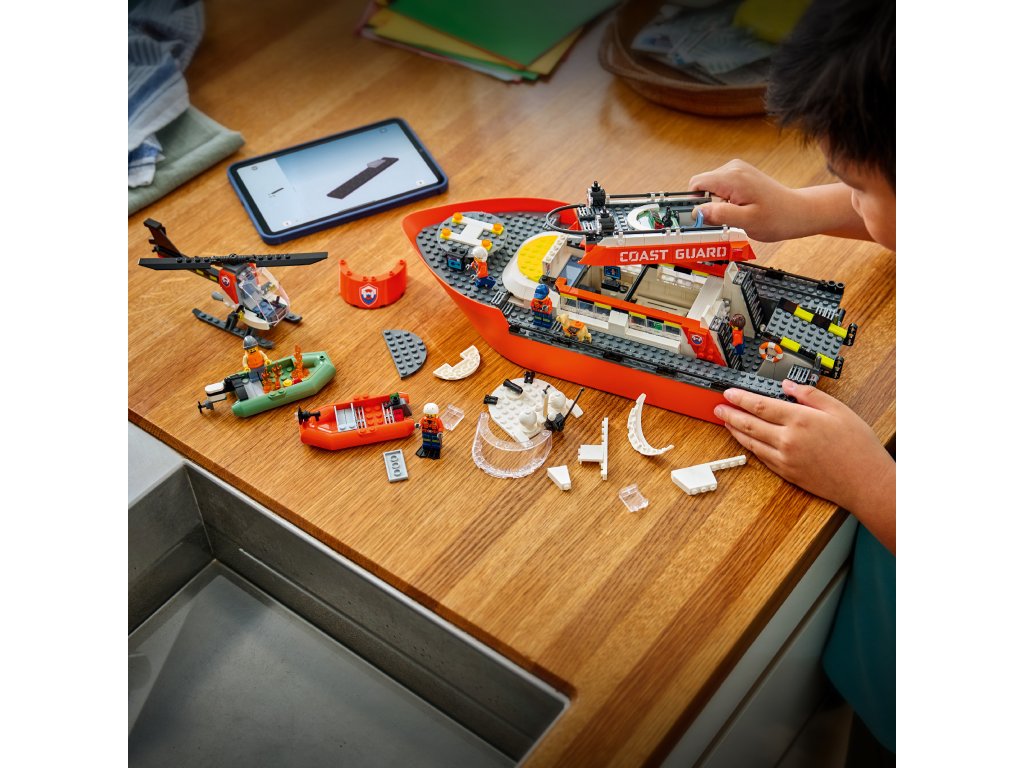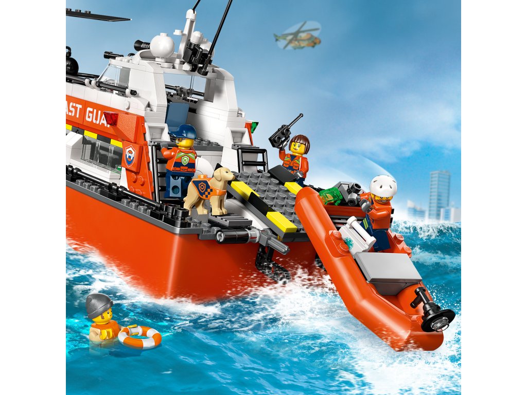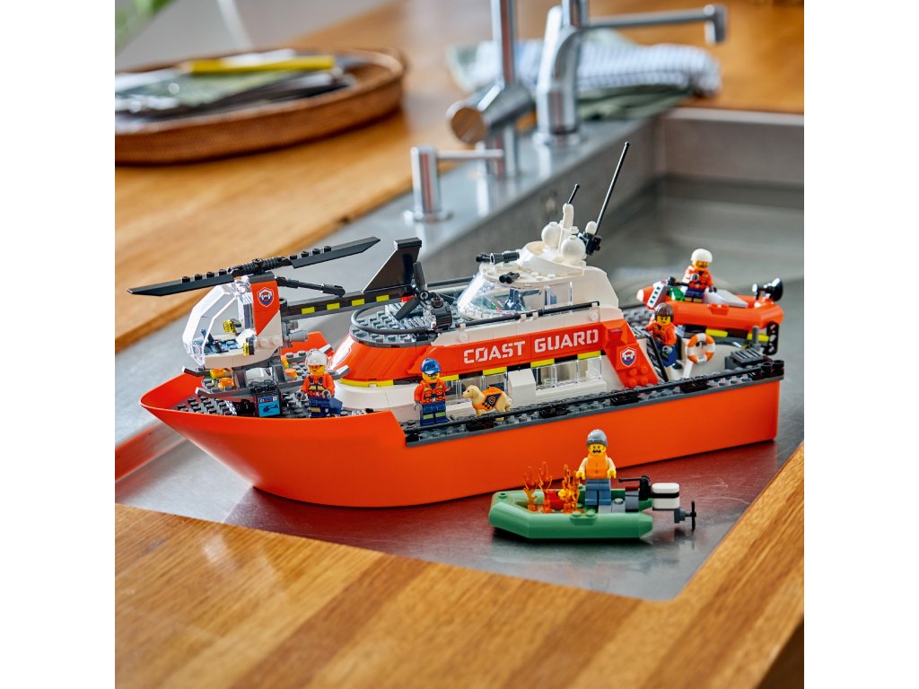 WHAT’S IN THE BOX – Includes everything kids need to build a floating LEGO® coast guard patrol boat, toy rescue helicopter and 2 floating dinghies, plus 5 minifigures and a dog figure
