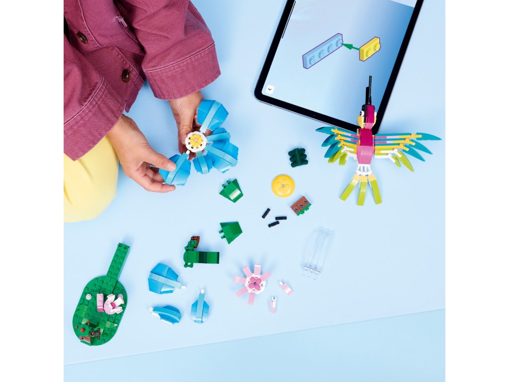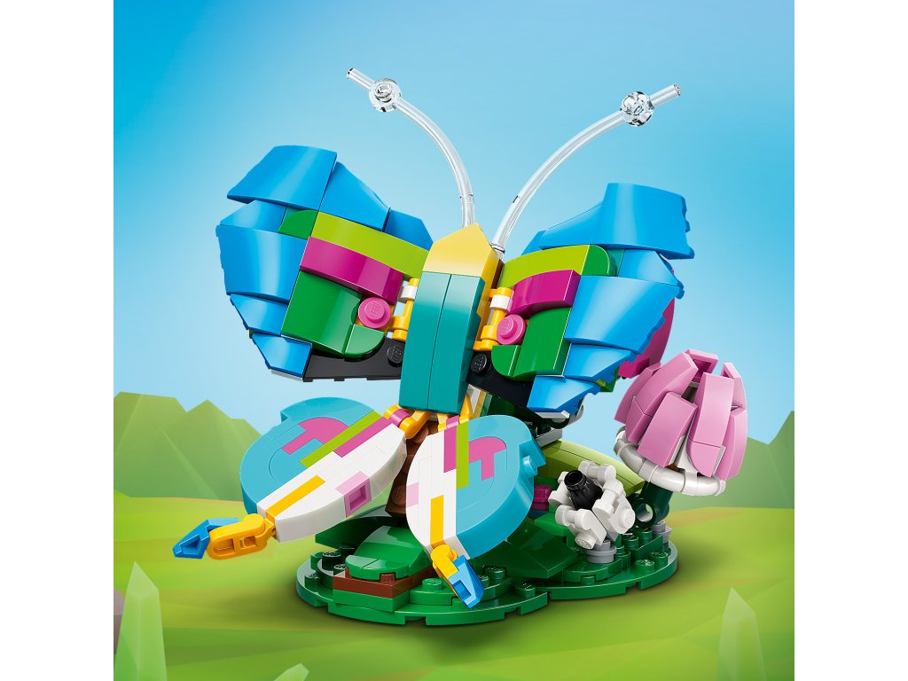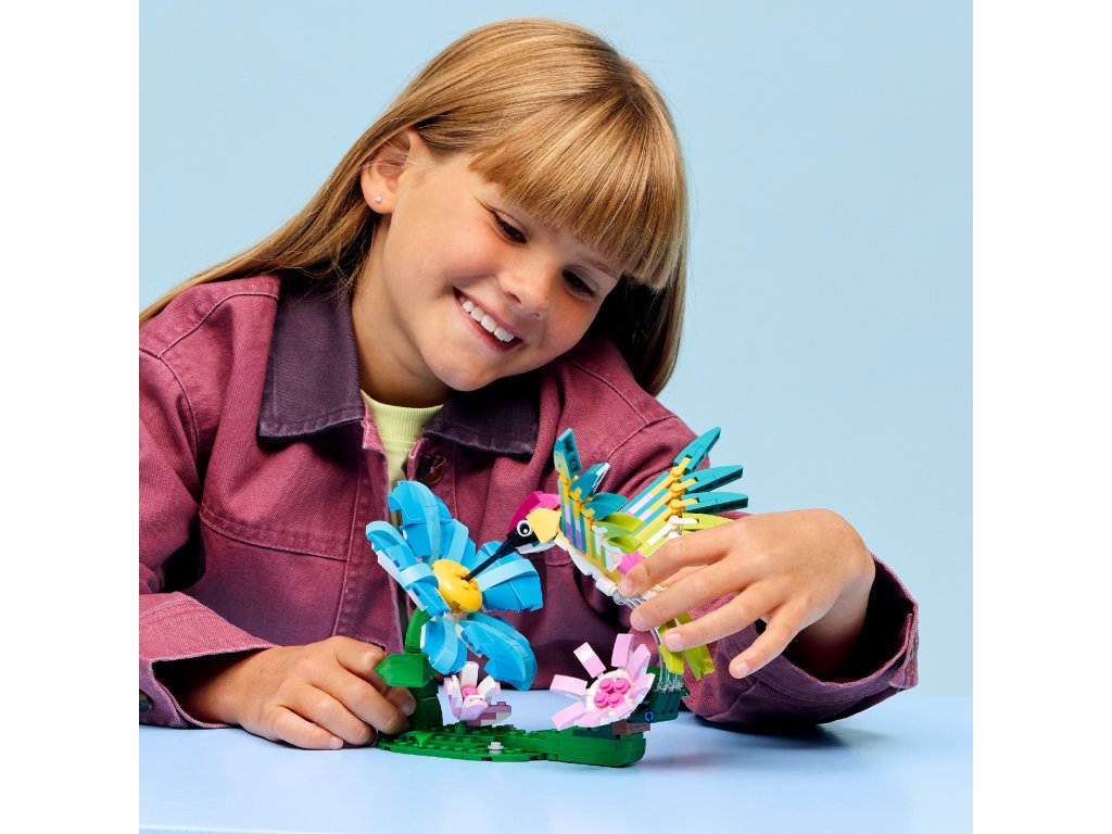 POSABLE LEGO® ANIMALS – The hummingbird is in a dynamic flying pose and can move its neck, wings and tail, while the butterfly can move its wings