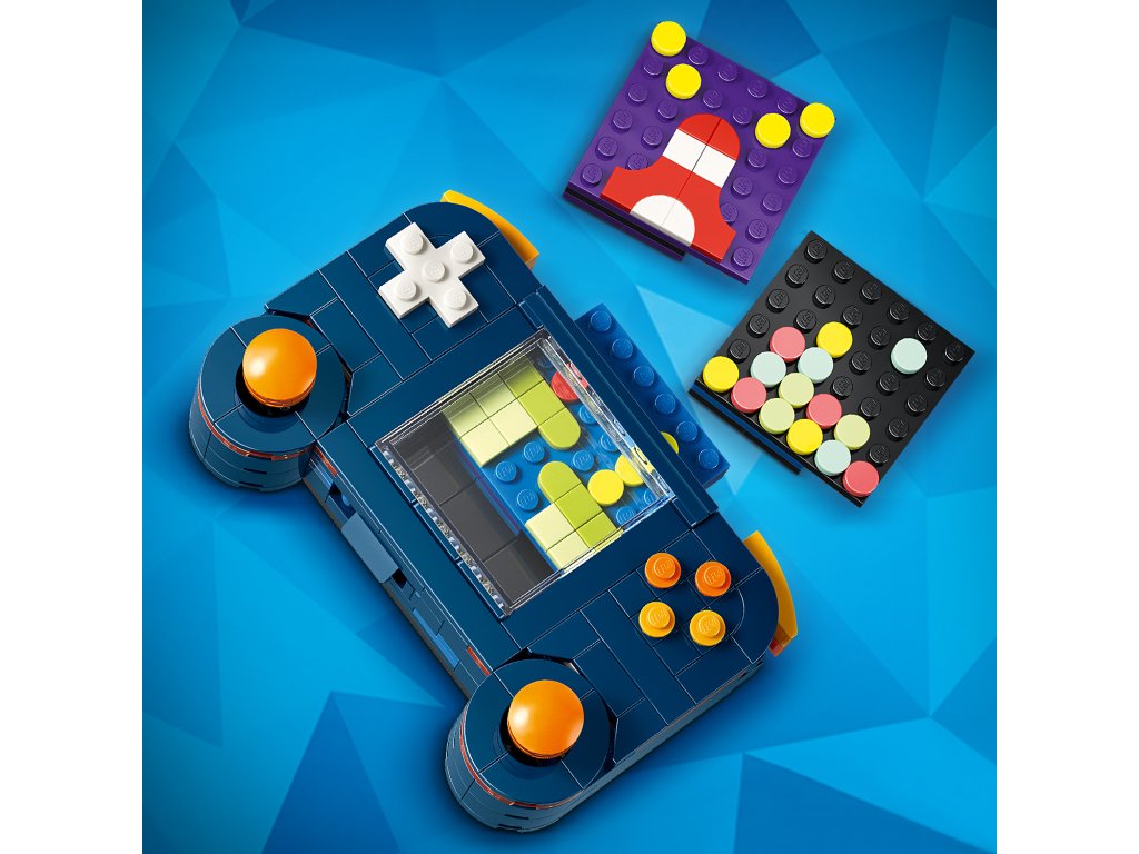 Boys and girls can choose to build a handheld gaming console toy with 2 moving joysticks and 2 moving buttons, plus a choice of 3 games cartridges to insert into it. This can then be rebuilt into a desktop mini computer, which includes a keyboard and monitor, a disk to place inside and a mouse, or an arcade game machine.