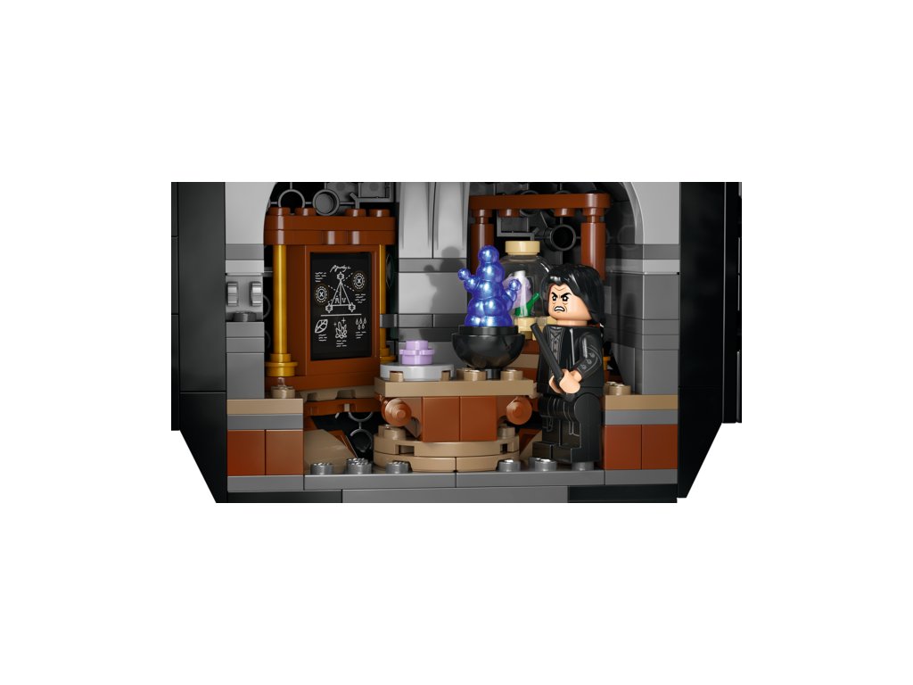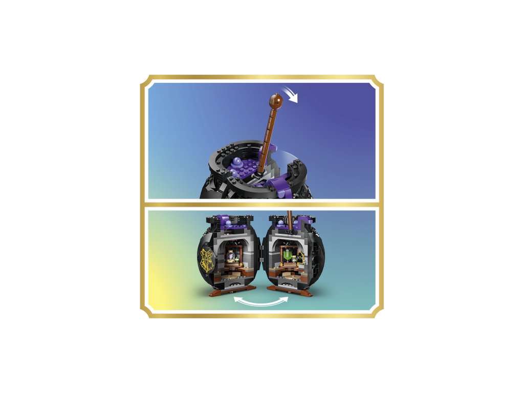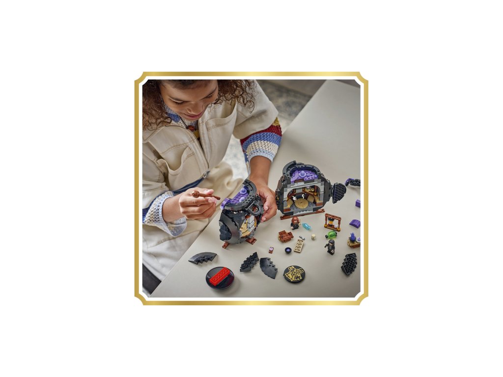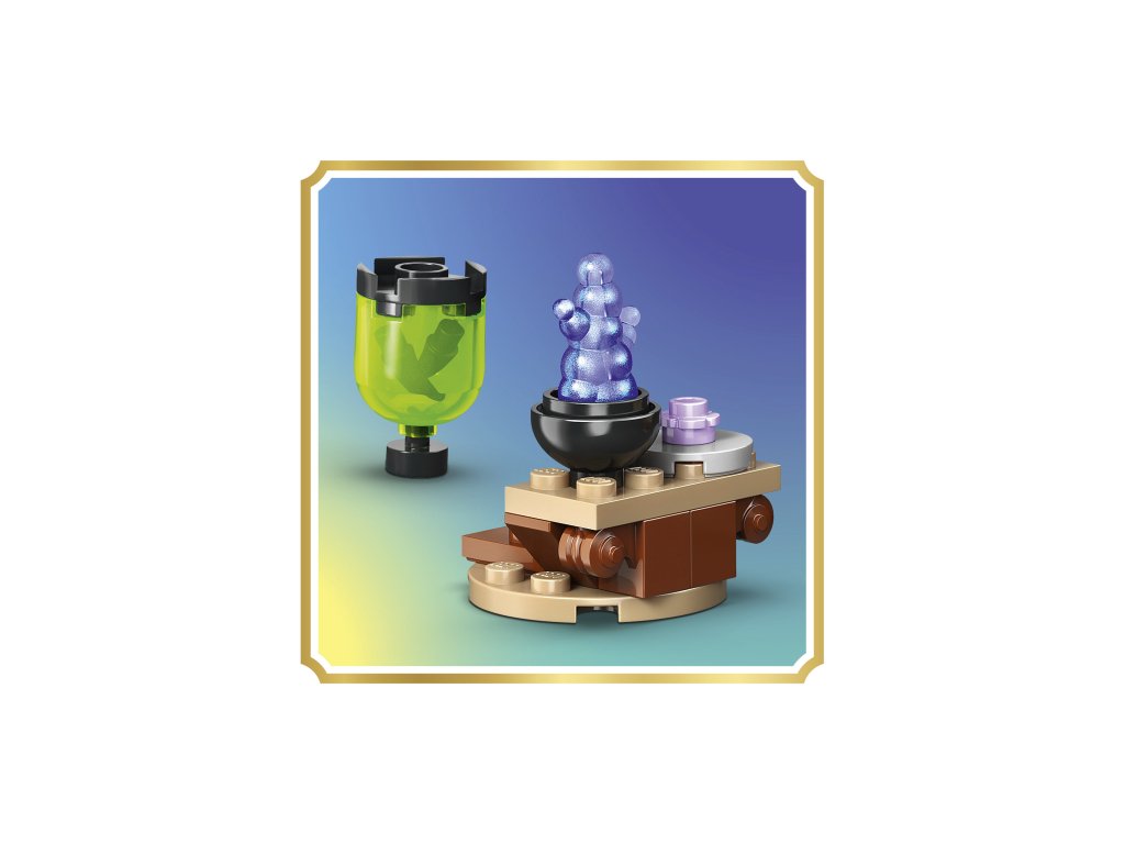 SECRET CLASSROOM – Move the stirring stick and reveal the classroom with removable tables for easy play, a blackboard, potion bottles and LEGO® ingredients for Wolfsbane, Polyjuice and Love Potions