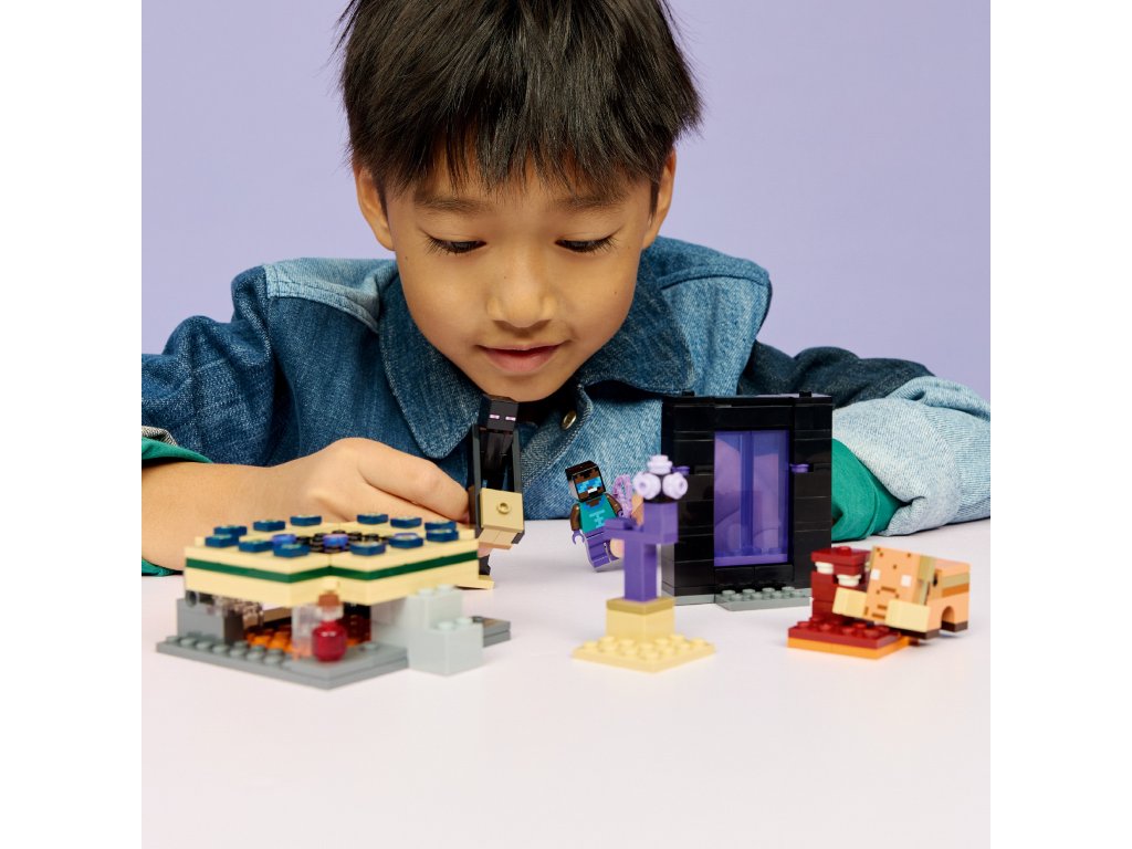 Transport Minecraft® players to a hands-on gaming adventure with the Nether & End Portal Journey (21584) gaming toy for boys and girls 7 years old and over. Pass through the portals to explore a build from each biome and embark on adventures with a Cool Hero minifigure, plus an Enderman and a baby hoglin figure.