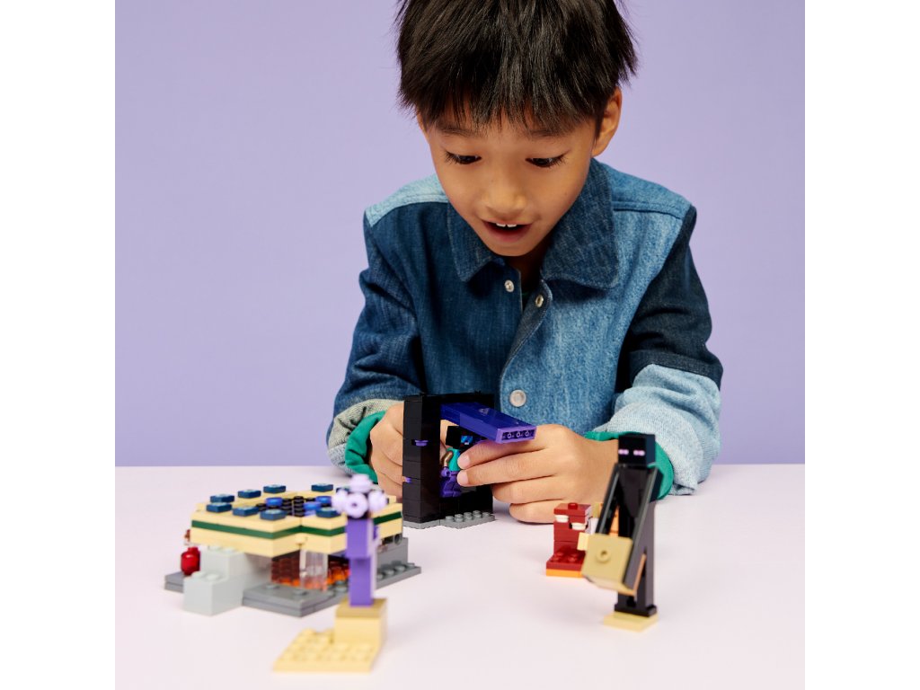 3 CHARACTERS, 2 PORTALS – Activate the toy’s portals and pass through to find a LEGO® build from each biome and Minecraft® action with a Cool Hero minifigure, plus an Enderman and a baby hoglin figure