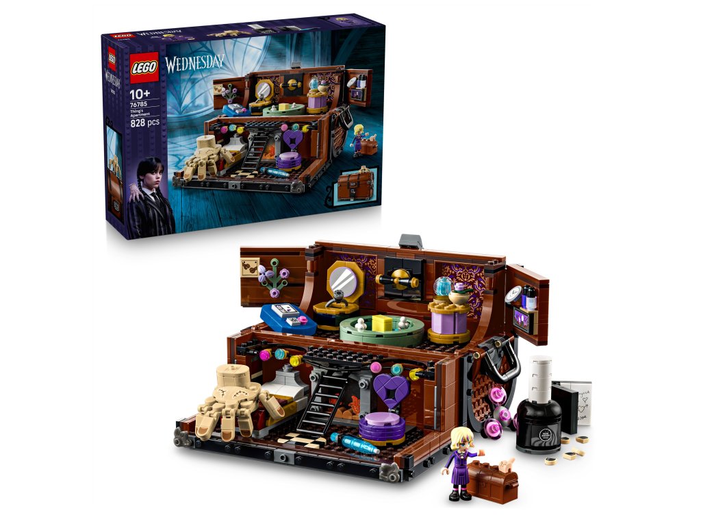 - Building toy trunk with Thing and Enid – Thing’s Apartment makes a great Halloween gift for Wednesday TV series fans aged 10 plus and comes with 2 characters and an opening trunk for play or display