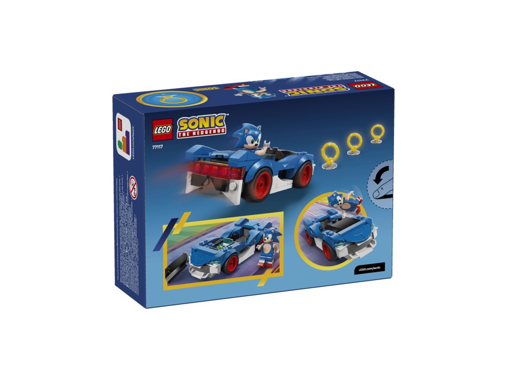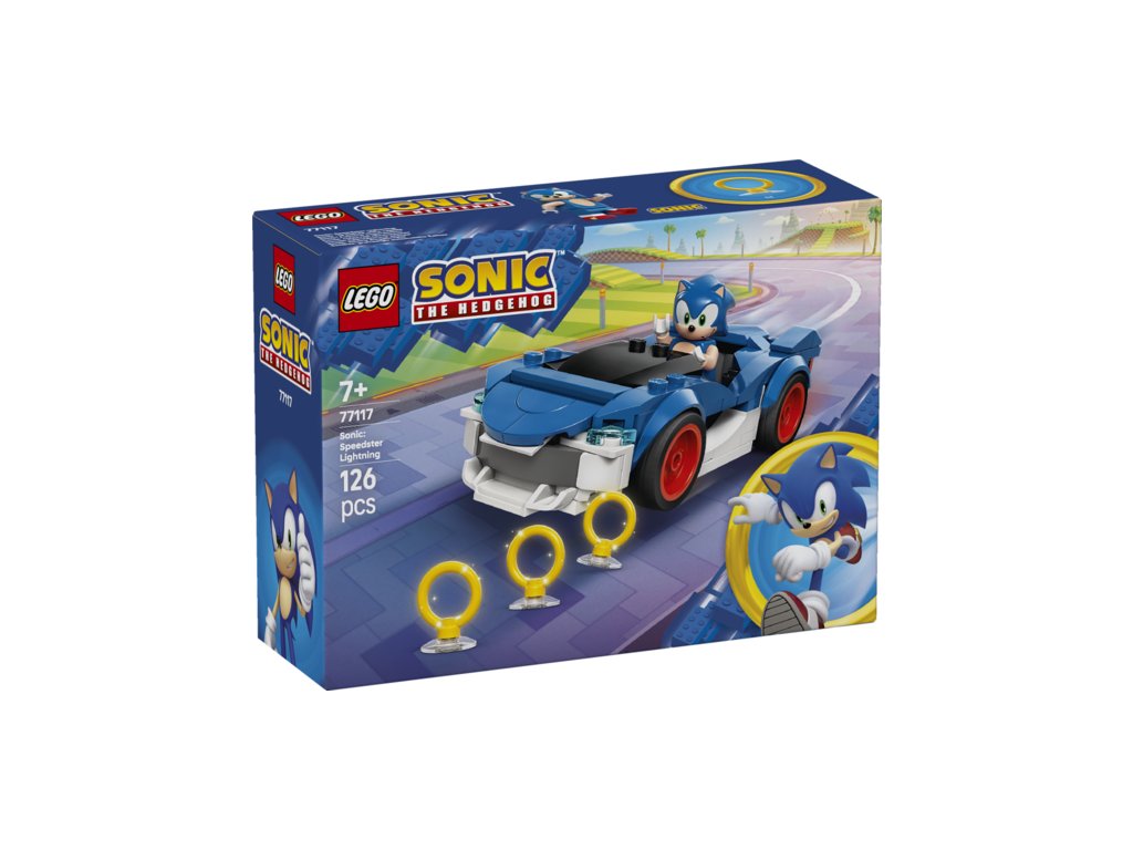 Fast-paced, race car adventures await kids ages 7 and up in this LEGO® Sonic the Hedgehog™ Sonic: Speedster Lightning (77117) building toy set. Based on the Sonic Racing: CrossWorlds console video game, boys, girls and gaming fans can race around and collect the 3 Gold Rings with a Sonic minifigure with mischievous face decoration. The blue-and-white interactive toy vehicle in this LEGO gaming set features wide, red-rimmed tires and an opening hood that reveals a hidden Chaos Emerald gem.