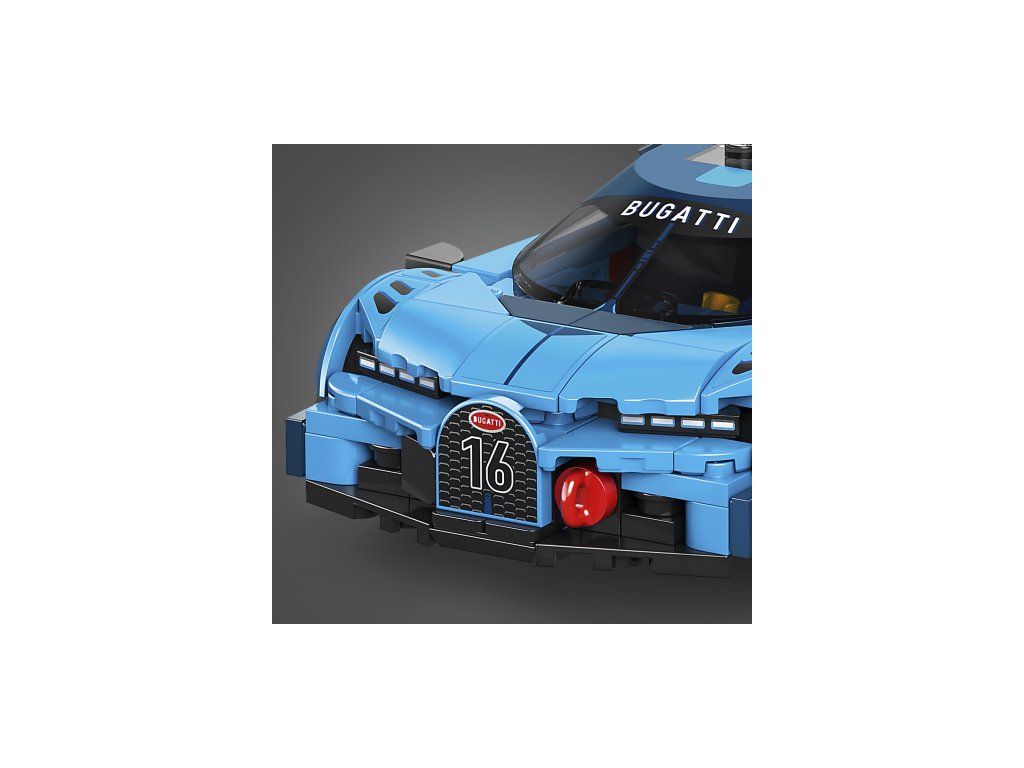 This Bugatti model car Includes details from from the car created by Bugatti for the Gran Turismo video game in 2015. This includes a horseshoe front grille, rear wing, distinctive 8-eye headlights, a roof fin and wide tires imprinted with ‘Michelin’. The car toy also includes a minifigure wearing a Bugatti outfit to place inside the cockpit to enjoy races.