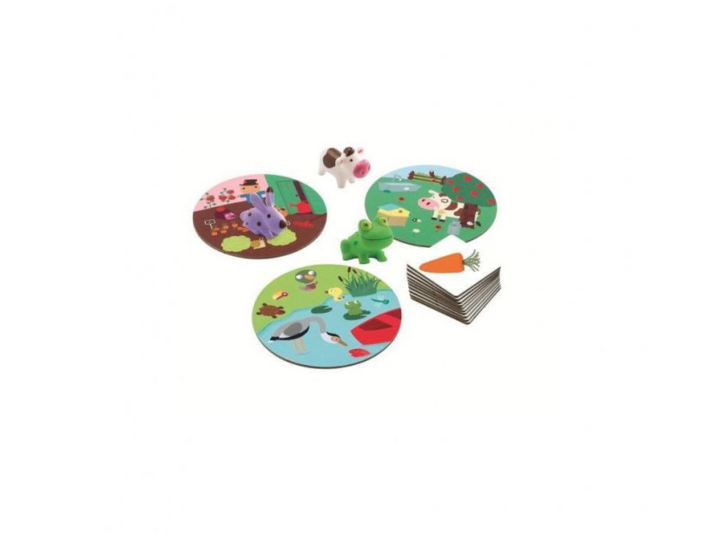 V průběhu hry otáčíte kartičky s obrázky různých věcí (co zvířátka jedí, co se typicky nachází v jejich prostředí) a ten, kdo nejrychleji uhodne, ze kterého prostředí (zahrada, rybník, louka) obrázek je, na něj postaví figurku a získá bod - uhodnutou kartičku. Délku hry si můžete určit podle toho, s jak velkými dětmi hrajete a kolik máte času.
