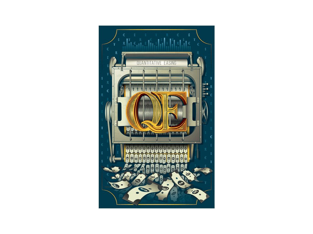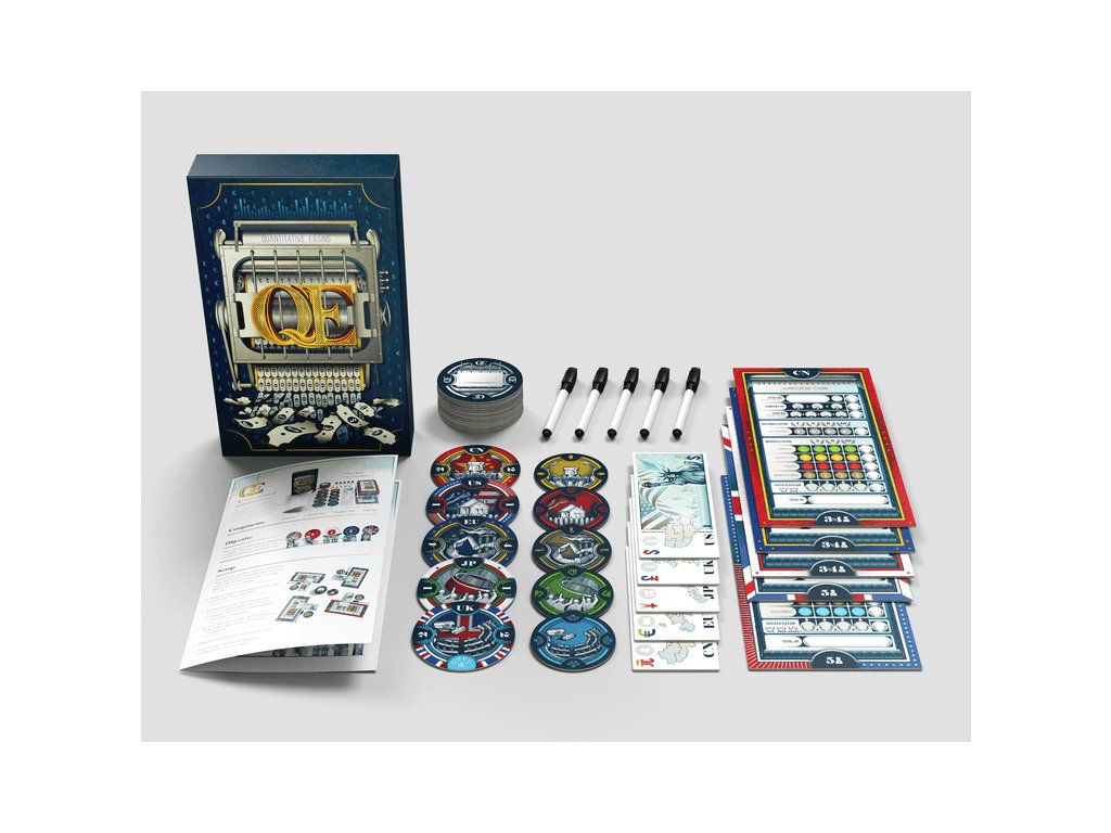Nastala finanční krize. Šestnáct společností „příliš velkých na to, aby selhaly“ ze čtyř zemí potřebuje záchranu. Centrální banky mají neomezené finanční zdroje, takže se bude tisknout spousta peněz, ale centrální banky také musí být obezřetné - vytisknou příliš mnoho peněz a země, kterou zastupují, se zhroutí. V QE, což je termín, který znamená „kvantitativní uvolňování“, hrajete roli centrální banky. Přihazujete na společnosti různých velikostí, abyste nashromáždili různé množství vítězných bodů. Částka, kterou nabídnete je neomezená, protože jste centrální bankou a vlastníte tiskový stroj! Po úvodní „otevřené“ nabídce od hlavního hráče draží ostatní hráči tajně. Po „záchraně“ šestnácti společností budou uděleny bonusové vítězné body za sady společností znárodnění, monopolizace a diverzifikace.