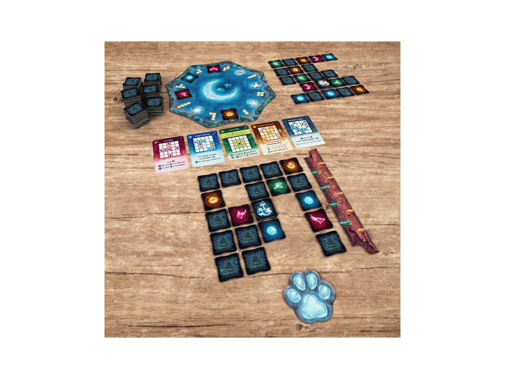 Wispwood is a family tile-laying game in which you explore an enchanted forest full of colorful will-o'-the-wisps. On your turn, choose a will-o'-the-wisp tile and a shape to place in your personal grid – your own growing forest. Each will-o'-the-wisp has a preference for where it wants to shine, and even the enchanted trees have their preferences! Your goal is to fulfill their expectations over three scoring rounds. Between rounds, the forest changes—it disappears and expands—but the fireflies you have already placed remain and shape future possibilities. Can you place your fireflies in the best possible way and make your cat's forest shine the brightest?