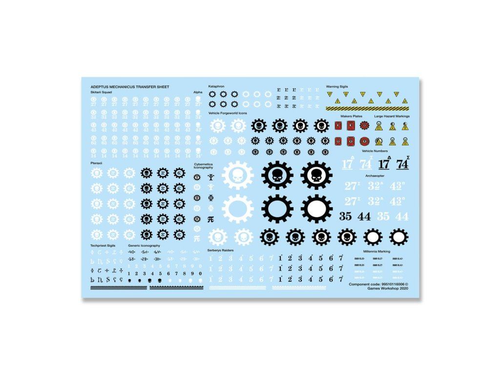 Každý přenosový list Adeptus Mechanicus obsahuje 320 vysoce kvalitních vodních přenosů. Patří mezi ně symboly Mechanicus, varovné znaky, čísla a další prvky pro zdobení vašich miniatur.