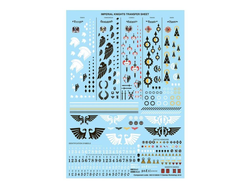 Arch obtisků Imperial Knights obsahuje 583 vysoce kvalitních vodních obtisků. Arch obtisků Imperial Knights Armiger obsahuje 277 vysoce kvalitních vodních obtisků. Tyto archy obsahují obtisky pro rytířské rody Terryn, Hawkshroud, Cadmus, Taranis a Raven, spolu s několika dalšími značkami, jako jsou identifikační symboly, bojové vyznamenání a značky výrobce.