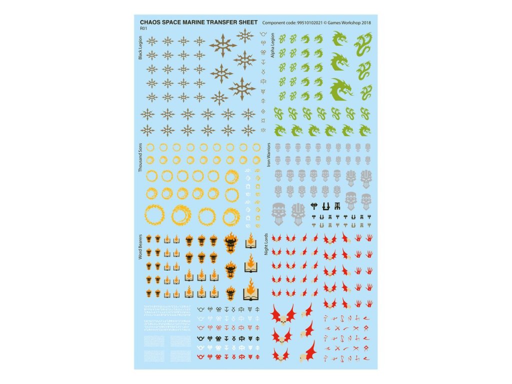 – 1x transferový arch Chaos Space Marines obsahující 364 vysoce kvalitních obtisků