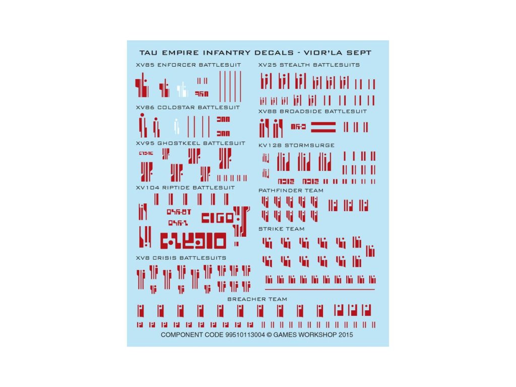 Tato sada je dodávána s 1x obtisky pěchoty T'au Empire – Vior'la Sept Transfer Sheet, obsahující 177 vysoce kvalitních obtisků. Ty zahrnují symboly pro Stealth Battlesuits a další jednotky T'au Empire, včetně Pathfinder Teams, XV95 Ghostkeel Battlesuits a dalších.