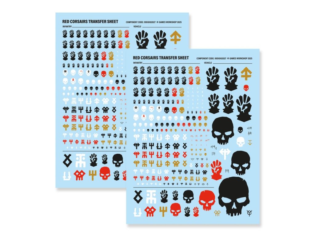 Tato sada je také dodávána s 2 listy pro přenos Červených korzárů, z nichž každý obsahuje 248 vysoce kvalitních transferů s vodními skluzavkami. Patří mezi ně výběr transferů velikosti pěchoty a vozidla s ikonografií Červených korzárů, lebkami, počty zabití a dalšími prokletými sigily.