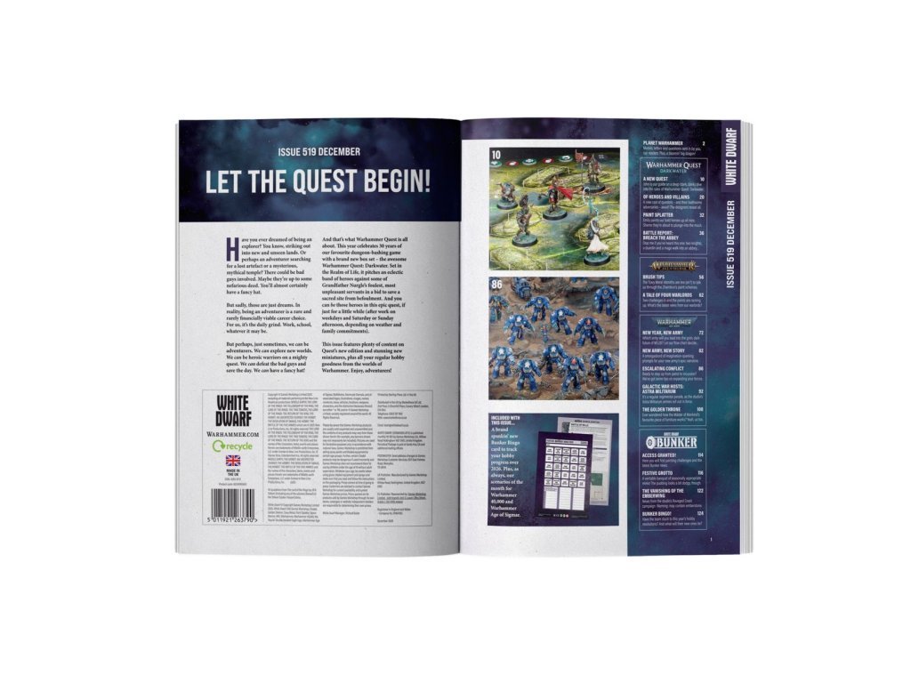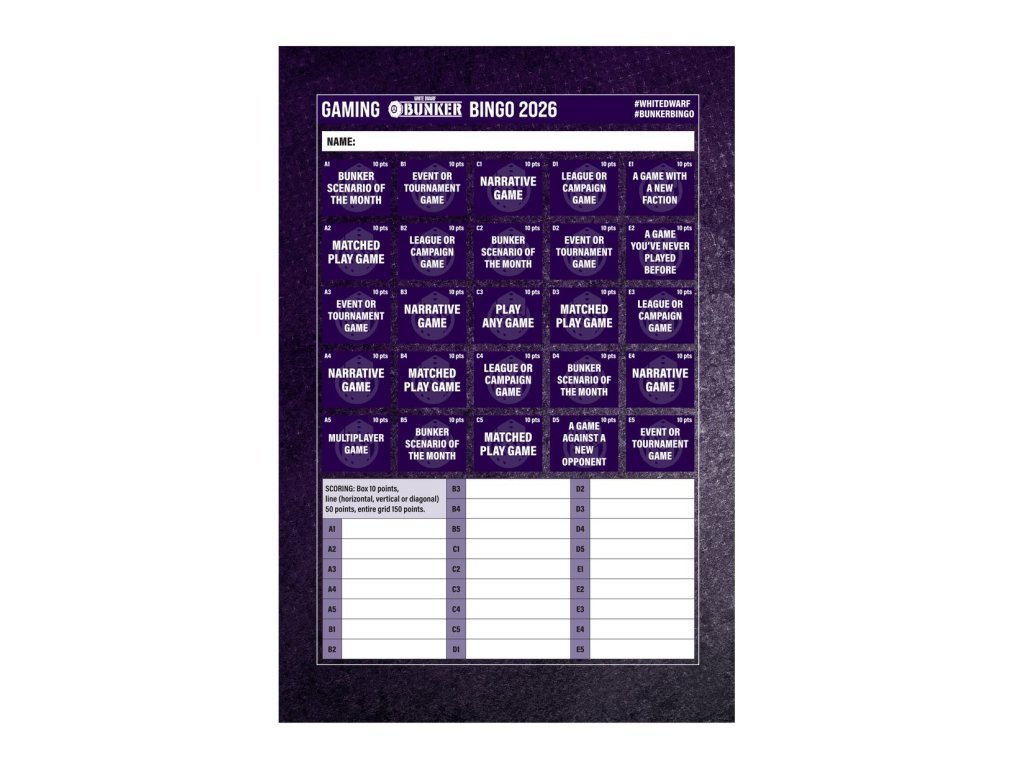 Každý výtisk White Dwarf 519 obsahuje také oboustranně potištěnou kartonovou přílohu se scénáři měsíce pro Warhammer 40.000 a Warhammer Age of Sigmar. Toto vydání obsahuje také kartu bunkrového binga pro rok 2026, abyste mohli zaznamenávat pokroky ve svém koníčku v roce 2026.