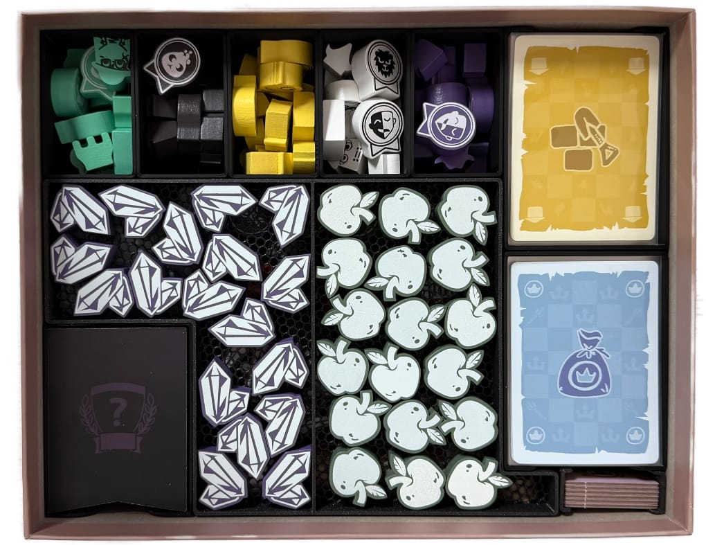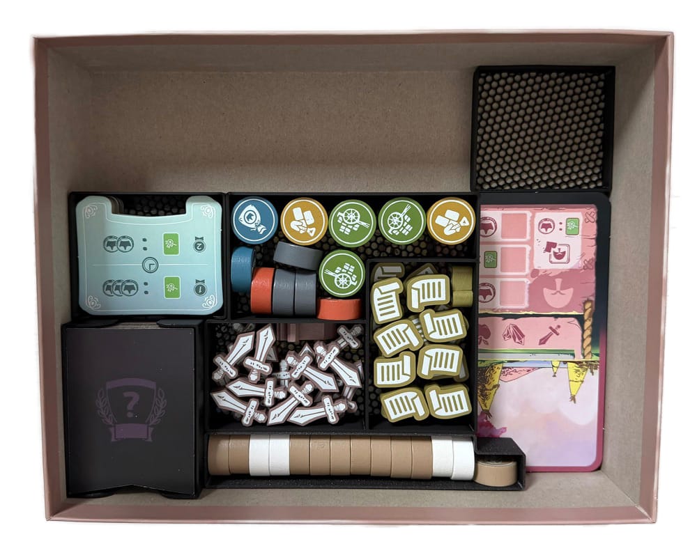 Insert je navržen tak, aby výrazně zrychlil přípravu i úklid hry a udržel pořádek v krabici. Všechny komponenty mají své místo a lze je bezpečně skladovat i ve vertikální poloze bez rizika rozsypání.