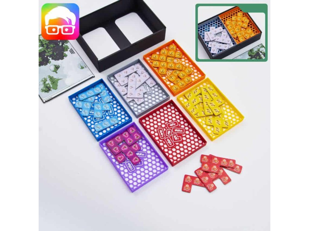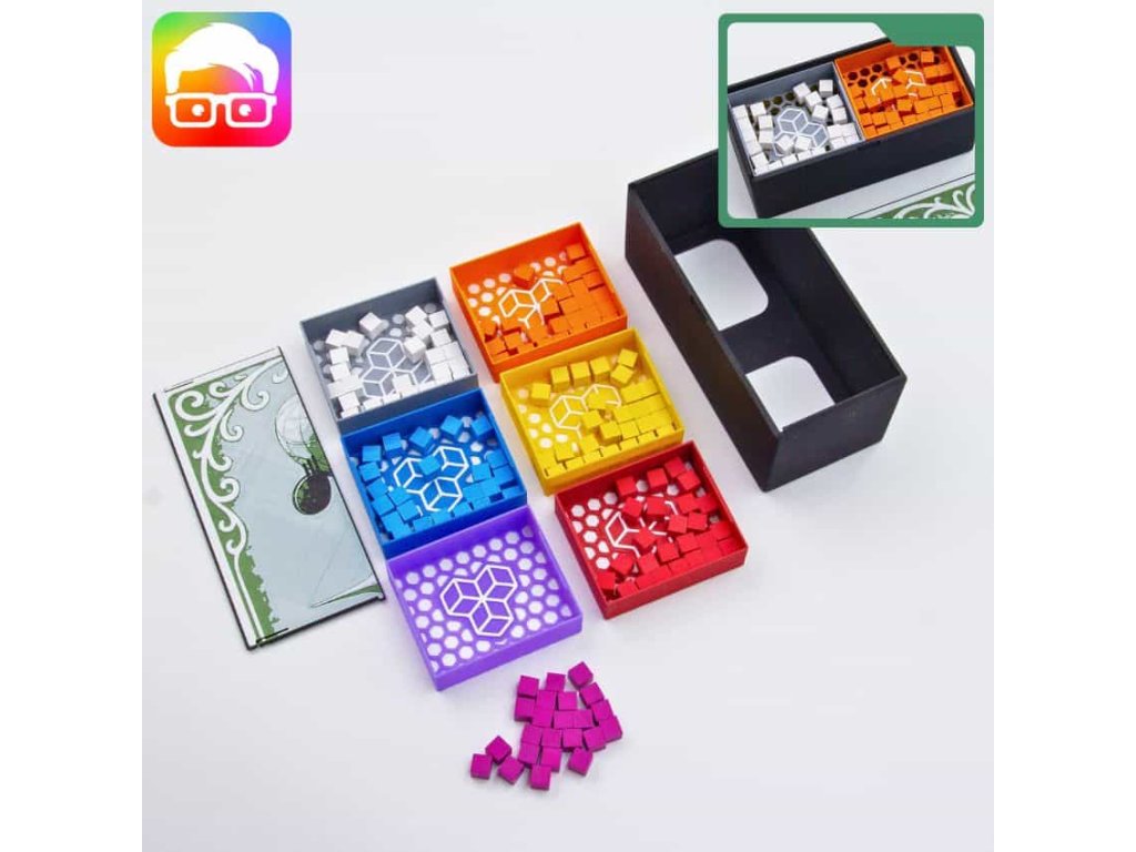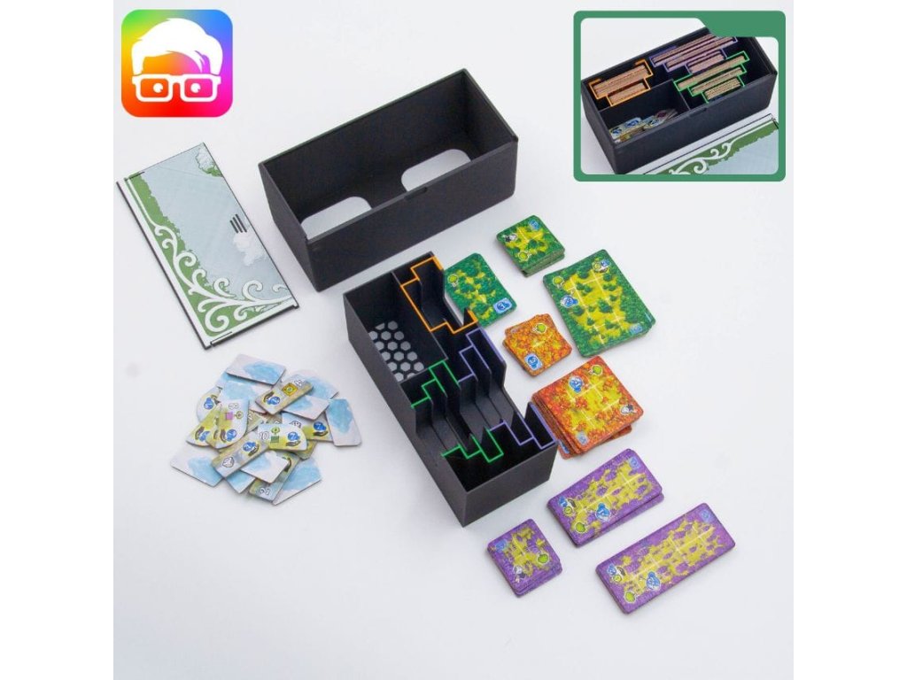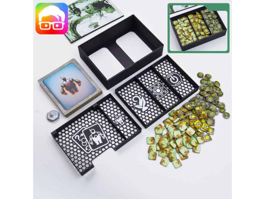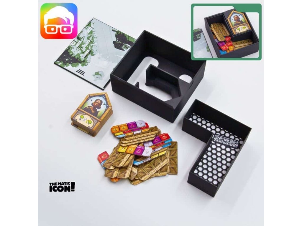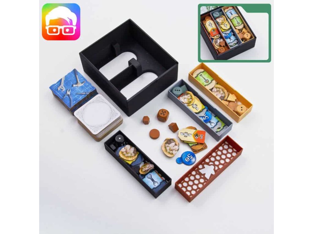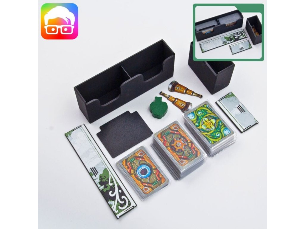 Insert je navržený tak, aby uspořádal všechny součásti základní hry uvnitř originální krabice. Díky zámkovým víčkům můžete krabici bez obav umístit vodorovně nebo svisle a z krabice nebude nic vypadávat. Insert podporuje obalené karty.