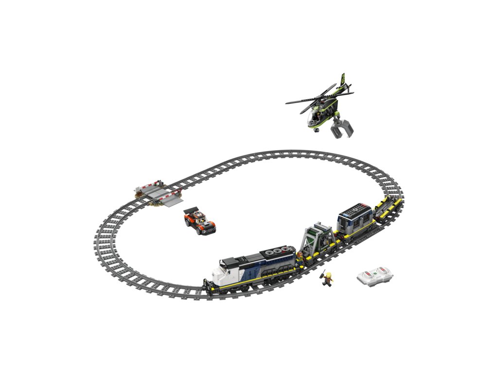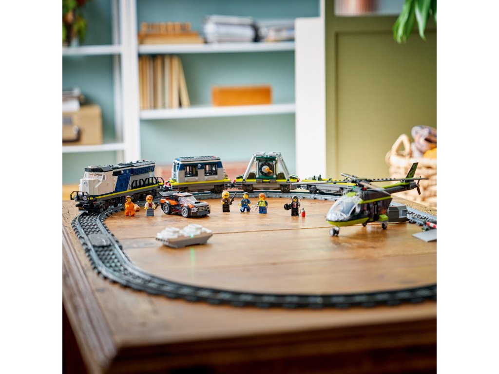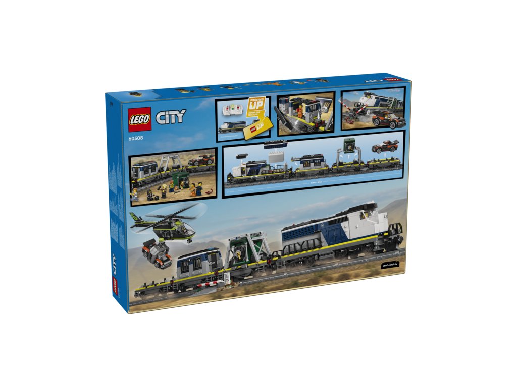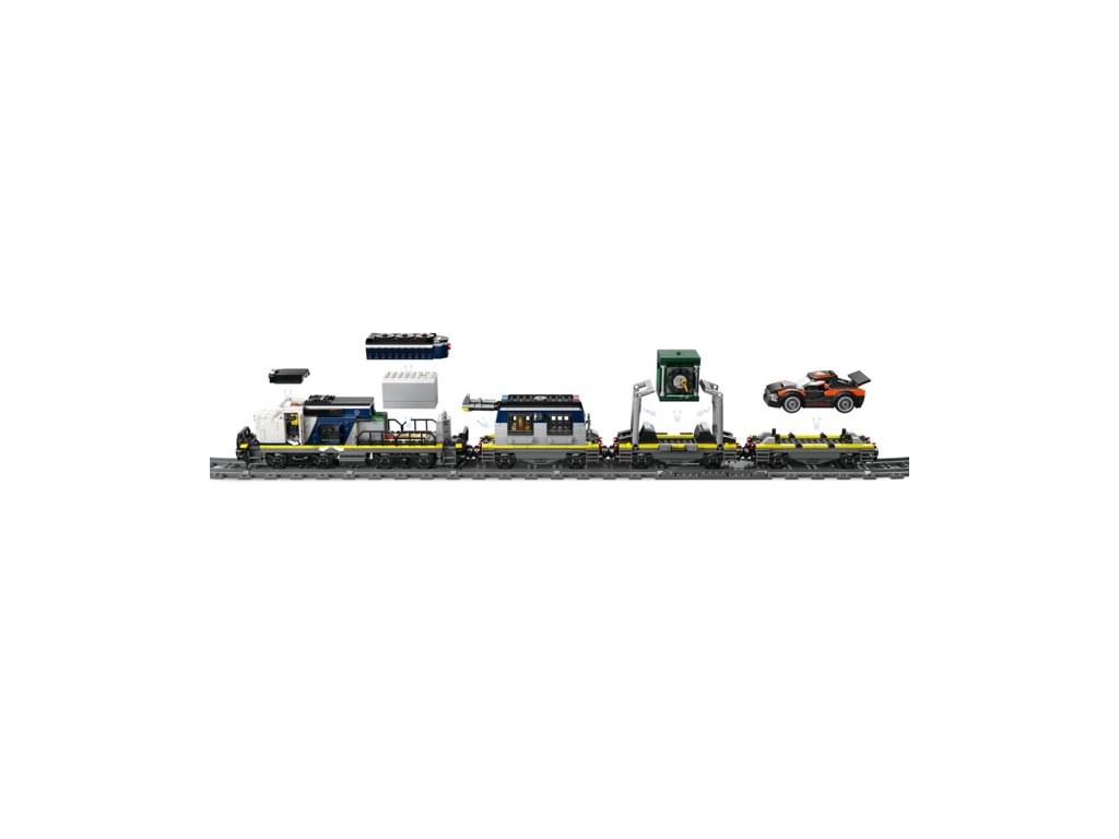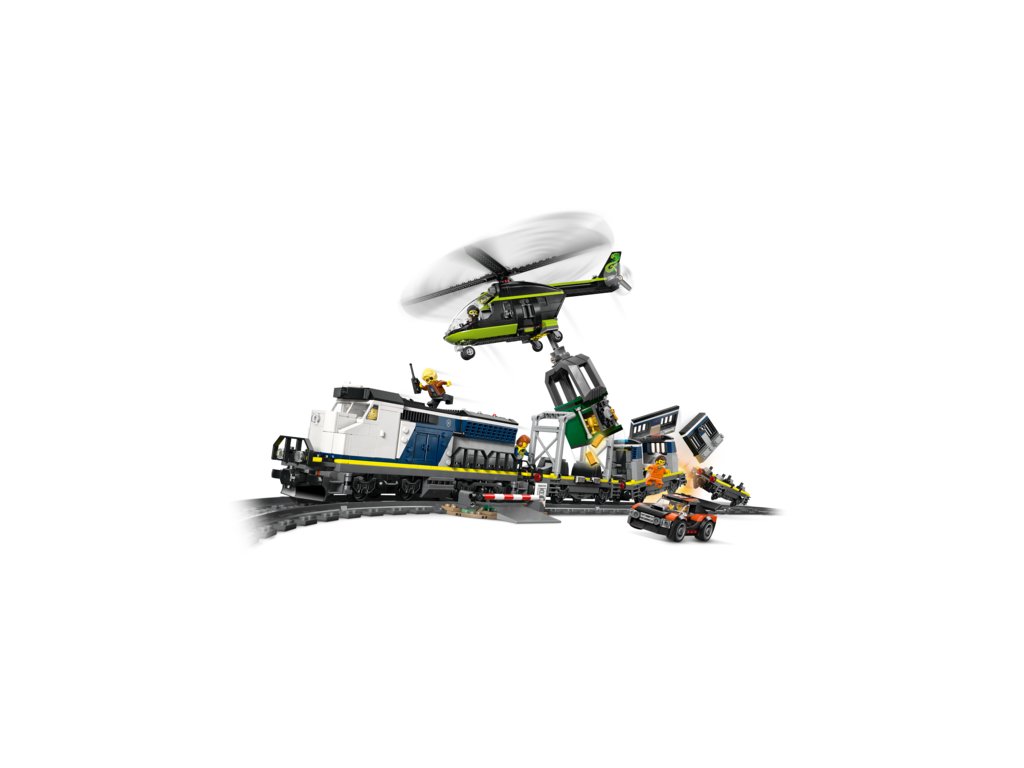 CO NAJDETE V KRABICI – Tato stavebnice vlaku obsahuje vše, co děti potřebují k sestavení lokomotivy s funkcí Powered Up, včetně 3 plošinových vagónů, závodního auta, vrtulníku, vězeňské cely, bankovního trezoru, železničního přejezdu a 6 minifigurek