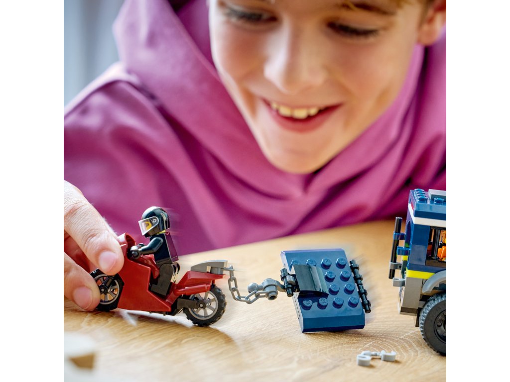 ÚTĚK Z VĚZENÍ – Děti můžou posadit minifigurku policisty do policejního vozu, zavřít zločince do cely a poté pomocí háku na modelu motorky vytrhnout dveře cely a zahrát si na velkolepý útěk
