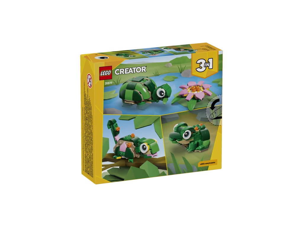 HRAČKA 3 V 1 PRO DĚTI – Se stavebnicí LEGO® Creator 3 v 1 Želva s leknínem (31377) si holky a kluci od 7 let postaví a přestaví 3 roztomilé figurky zvířátek ze stejné sady kostek