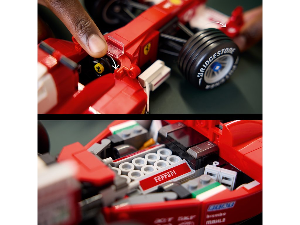 VLASTNOSTI A FUNKCE – Model LEGO® Ferrari F1 je vybaven funkčním řízením, detailním kokpitem, motorem V10 a drážkovanými hladkými pneumatikami s potiskem Bridgestone Potenza
