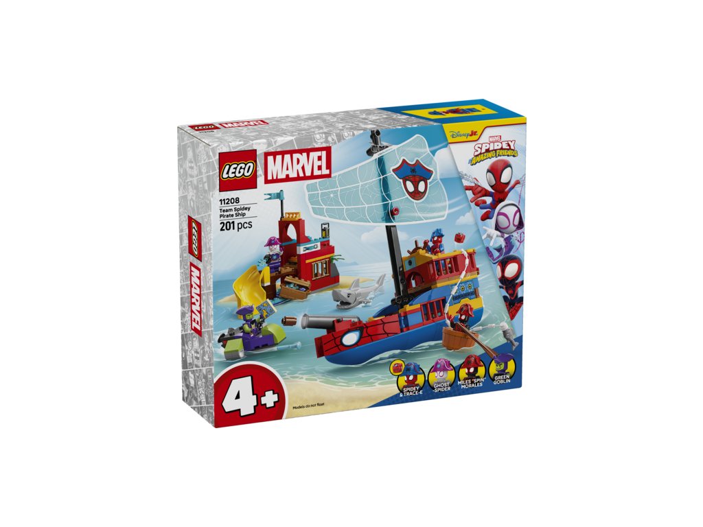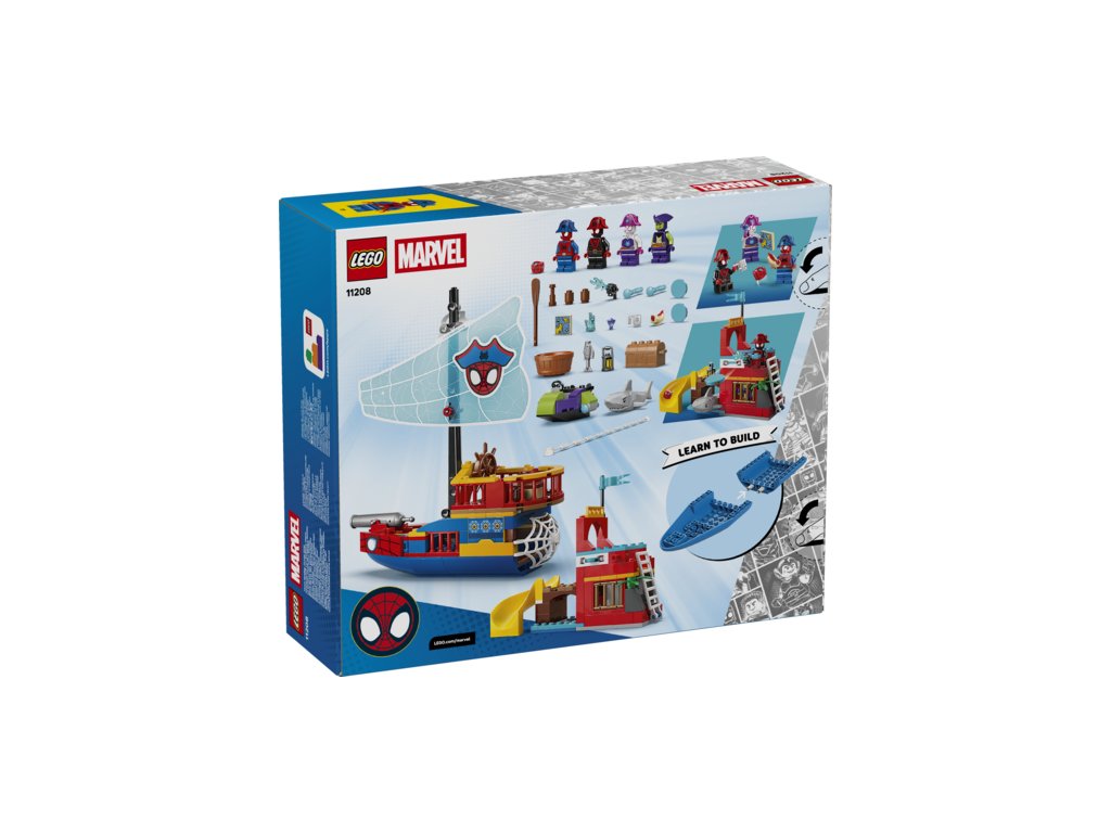 SUPERHRDINSKÁ PIRÁTSKÁ LOĎ – Nastupte na palubu pavoučí lodě Webs Ahoy a zastavte Zeleného Goblina, který ukradl truhlu s pokladem v této dobrodružné stavebnici LEGO® ǀ Marvel Pirátská loď Spideyho týmu (11208) pro kluky a holky od 4 let