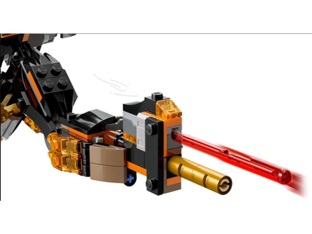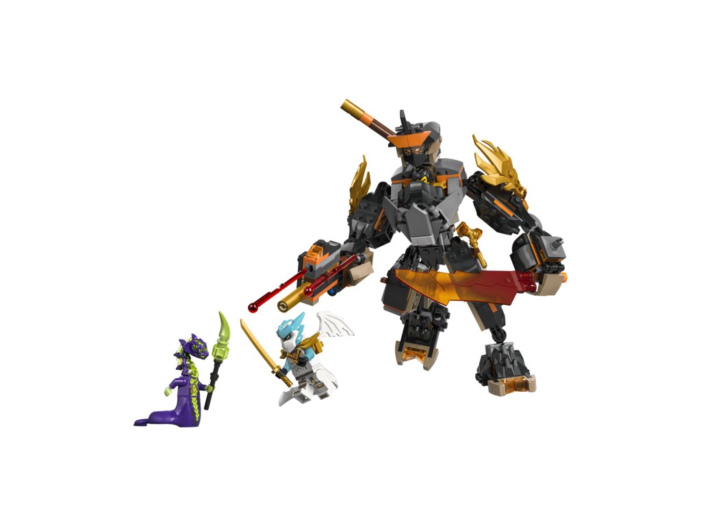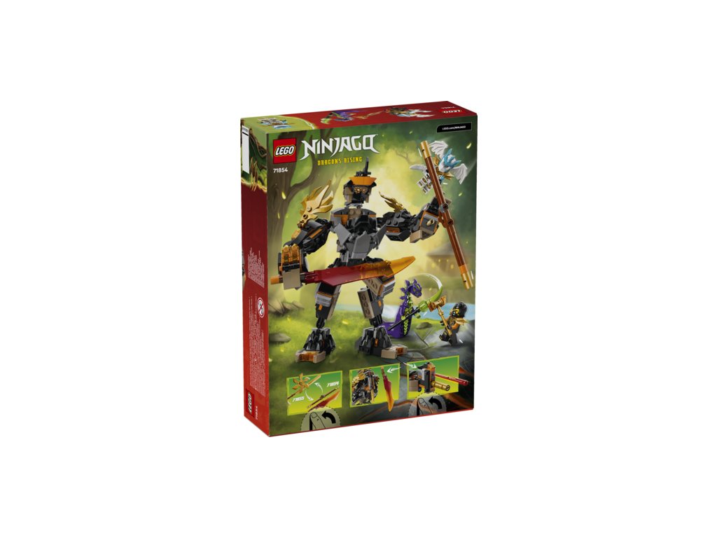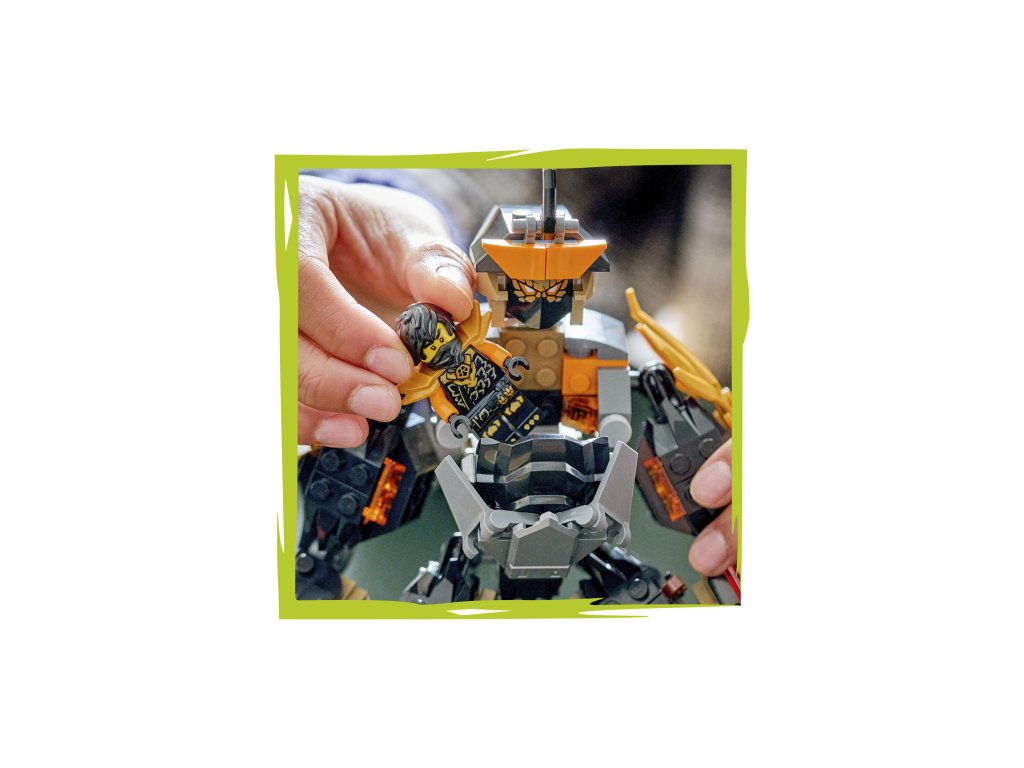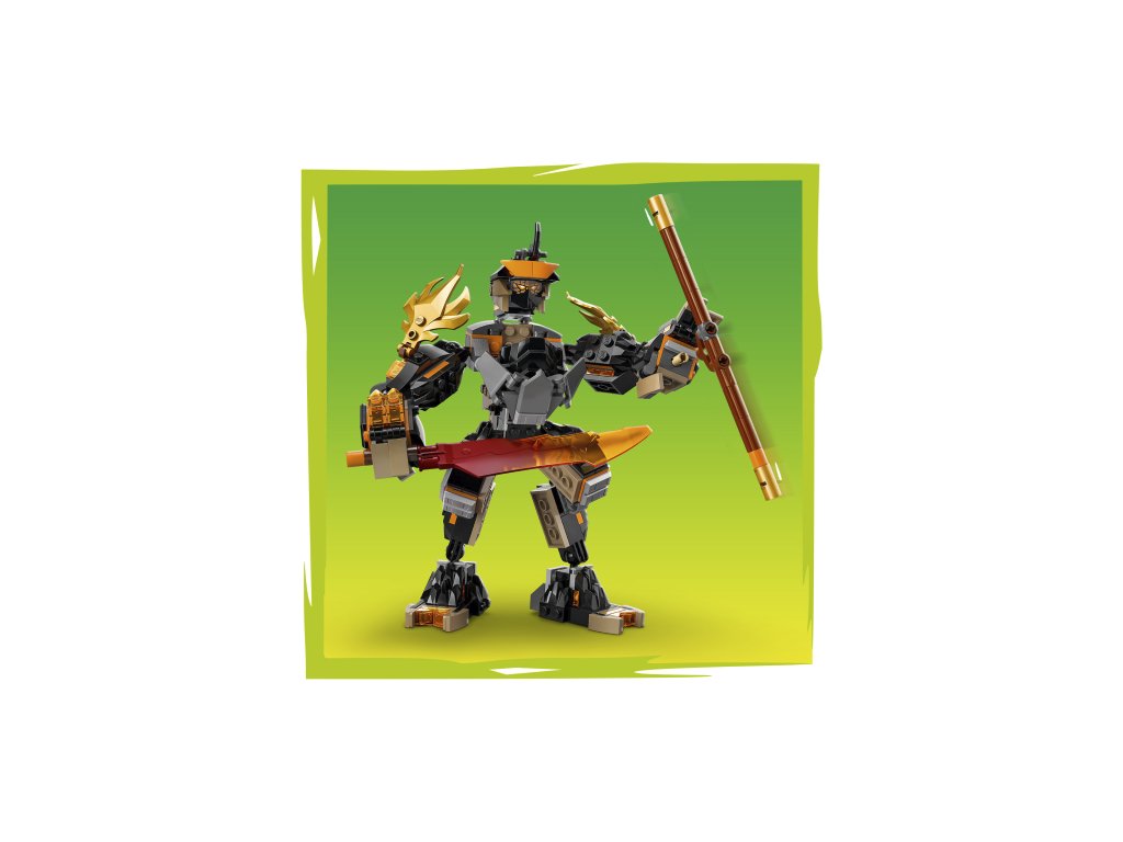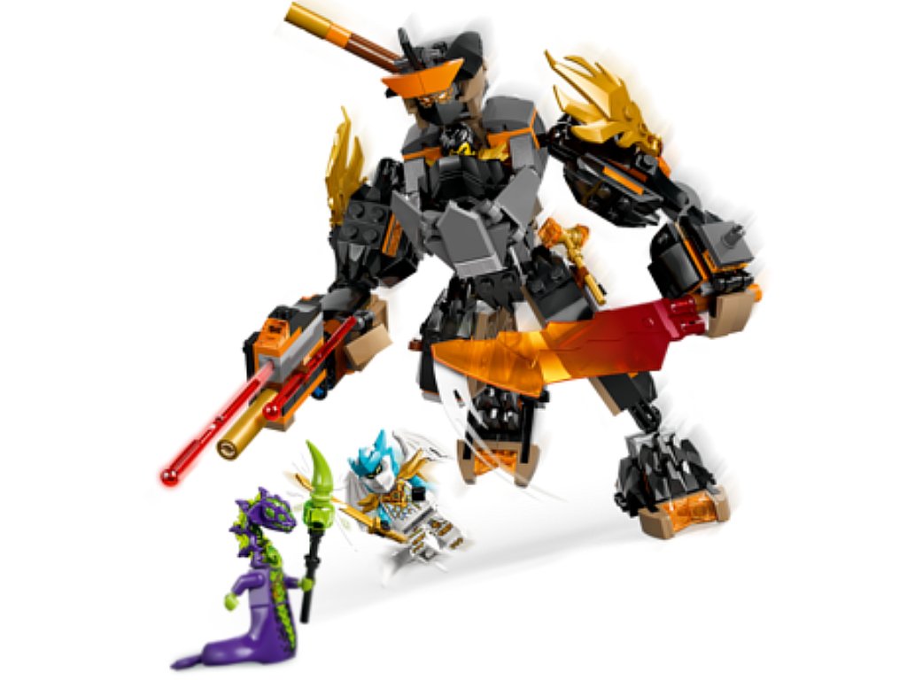 Robot má 3 zbraně: meč, hůl a pružinový blaster se 2 šipkami, které lze vyměnit za zbraně ze stavebnice Bitva nindžovského draka Riyu (71855) (prodává se samostatně). Tato hračka NINJAGO obsahuje také 3 minifigurky: Colea s kladivem, Zanea v dračí podobě s mečem a kyselinové monstrum s holí pro hraní bitev.