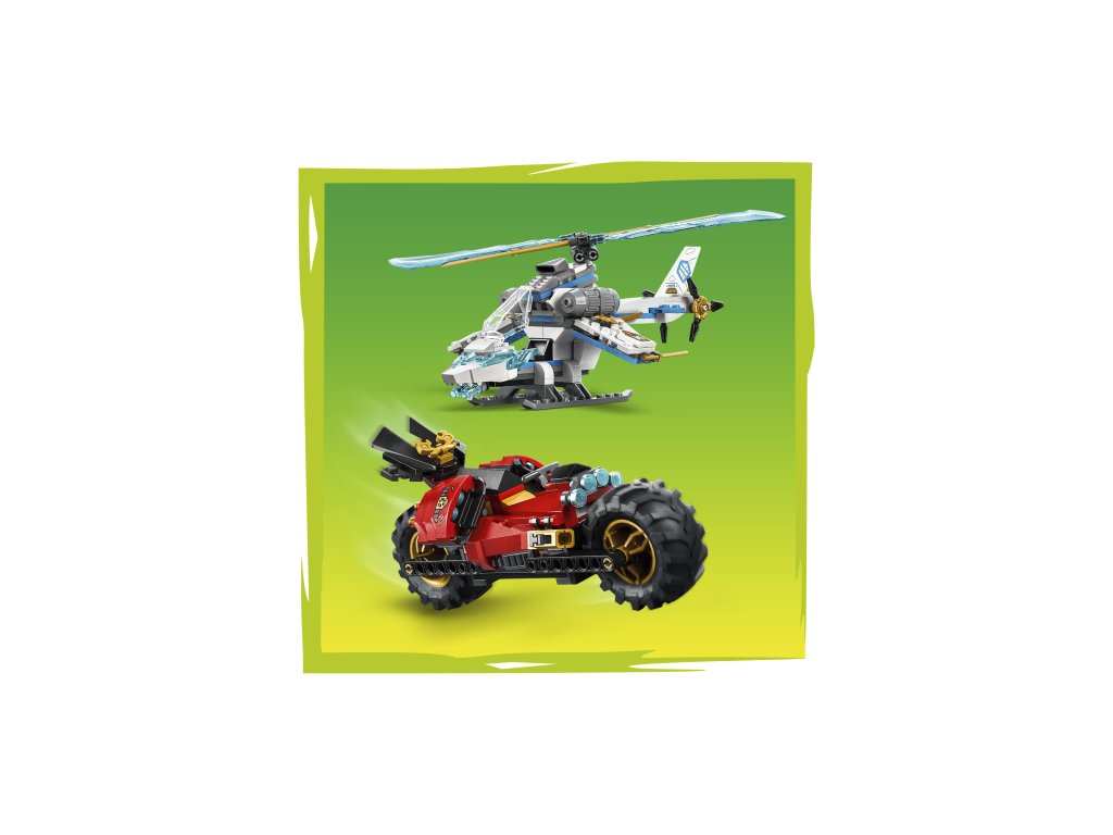 2 VOZIDLA NINDŽŮ – Motorka nindžů má pohyblivá kola, sedlový kokpit pro minifigurku a 2 vystřelovače, a helikoptéra má otevírací kokpit a otočné vrtule