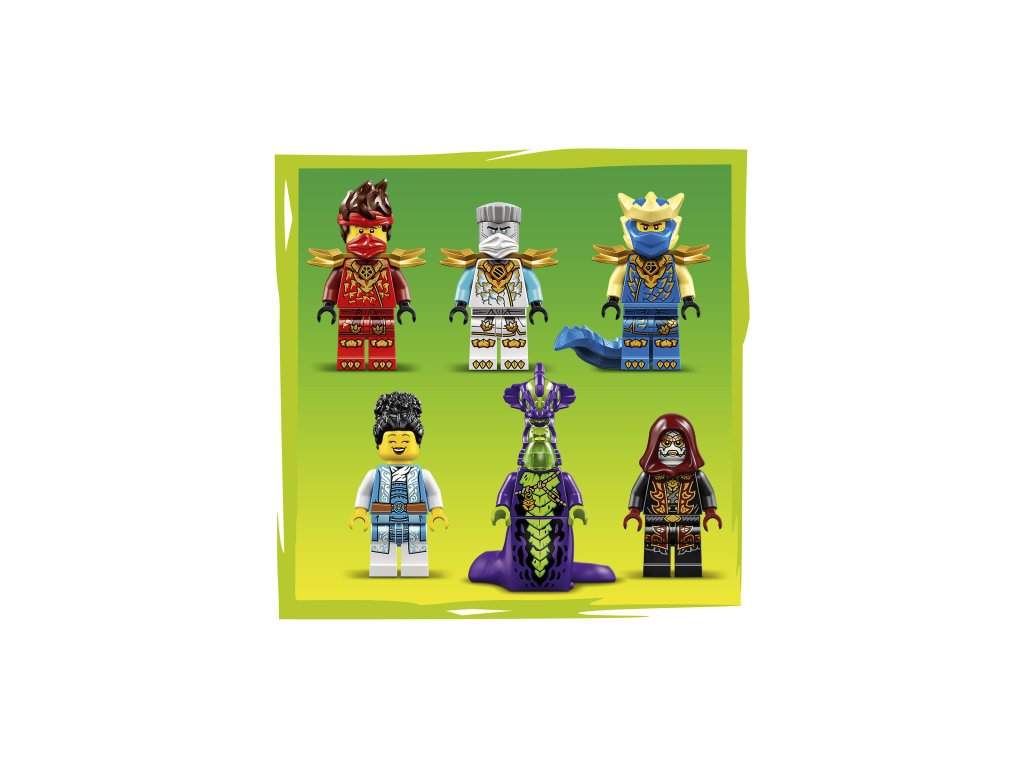 Stavebnice NINJAGO obsahuje 6 minifigurek: Kaie, Zanea, dračího Jaye a Euphrasii, kteří se pustí do boje proti kyselinové příšeře a loajalistovi. Aplikace LEGO® Builder dodává dětem při stavění jistotu – můžou přibližovat a otáčet modely ve 3D a sledovat postup pomocí srozumitelného digitálního návodu. Stavebnice obsahuje 642 dílků.