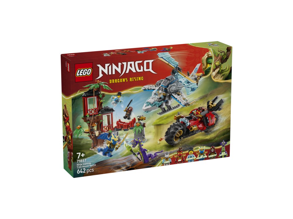 Stavebnice Souboj nindža vozidel a domek na stromě (71857) inspirovaná 4. řadou seriálu NINJAGO® Dračí povstání přináší vše, co děti od 7 let potřebují potřebují k přehrávání akčních bitev. Tato bojová stavebnice obsahuje třípatrový domek na stromě, helikoptéru, motorku a 6 minifigurek.