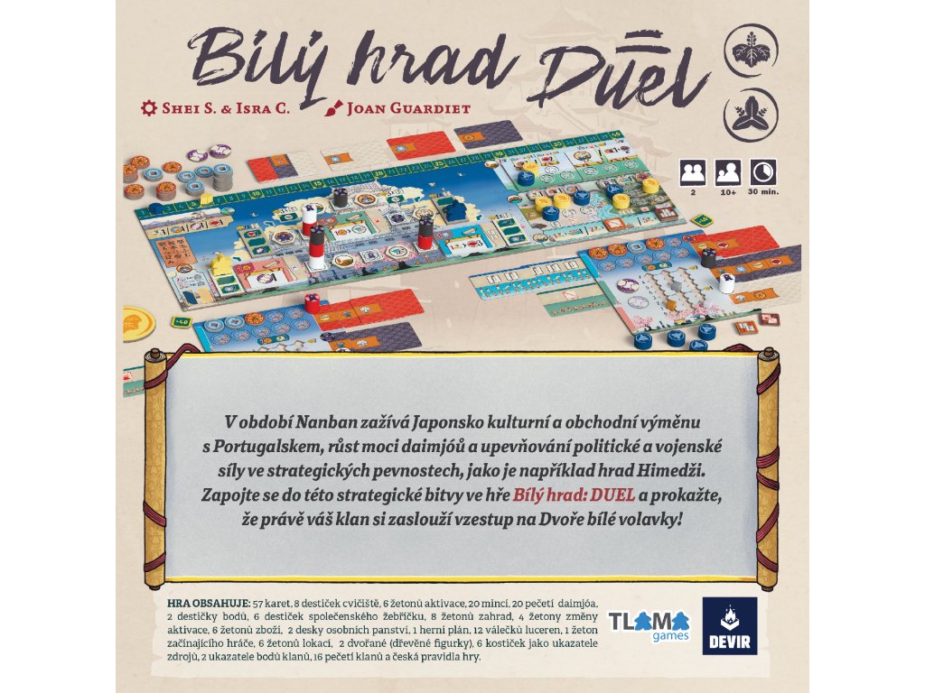 Bílý hrad: Duel je strategická hra pro dva hráče, ve které se střídáte v tazích během dvou kol – vykládacího a stahovacího. V každém tahu umisťujete nebo odebíráte válečky luceren, čímž aktivujete různé oblasti svého panství a získáváte odměny. Každý tah zahrnuje volitelné přeuspořádání žetonů aktivace, výběr akce (umístění nebo odebrání válečku), zisk odměny lucerny a provedení dvou sousedících akcí – například nákup karet vlivu, obchodování, výcvik, pohyb dvořana po společenském žebříčku nebo umístění pečetí do zahrad. Hráči sbírají body klanu během hry i při závěrečném bodování, které zohledňuje nasbírané symboly, pozice na žebříčku, zboží a vylepšené karty. Vítězem se stává ten, kdo nejlépe využije své zdroje, taktiku a načasování akcí k získání největšího vlivu na Dvoře bílé volavky. Bude to právě váš klan?