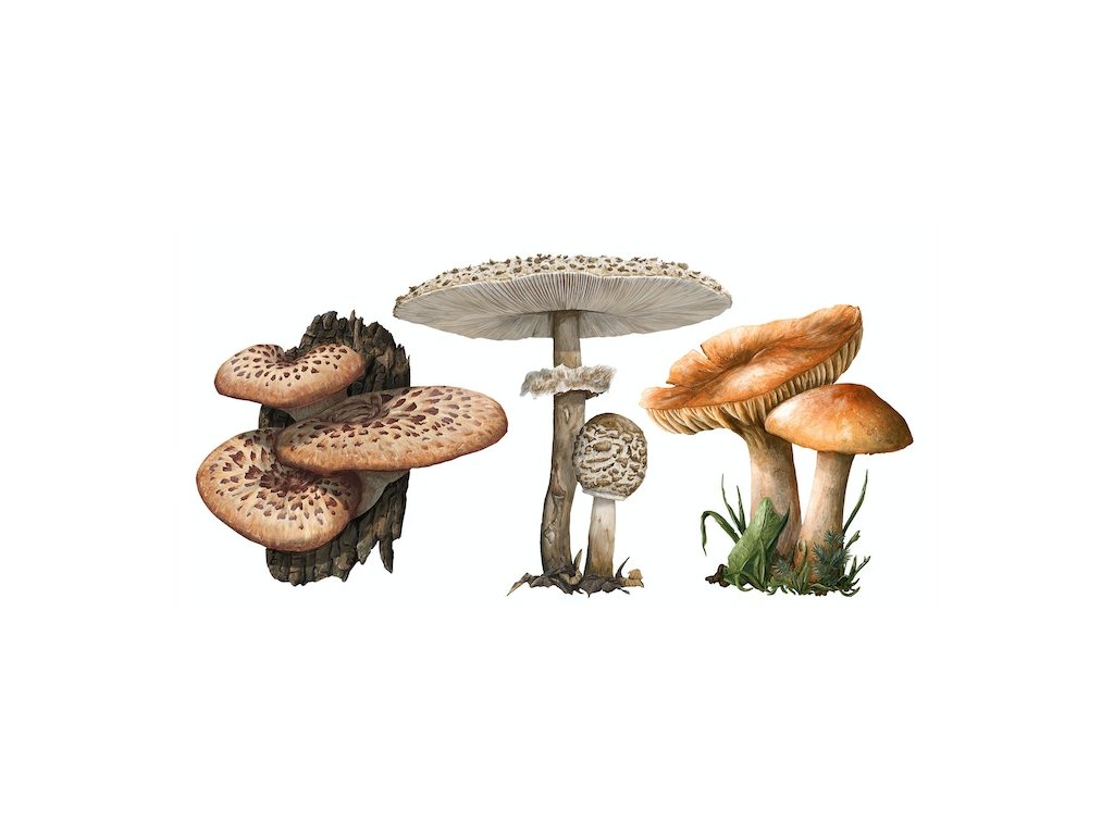 Podhoubí obsahuje krásné a přesné ilustrace v botanickém stylu s více než 69 houbami, které lze najít ve volné přírodě.